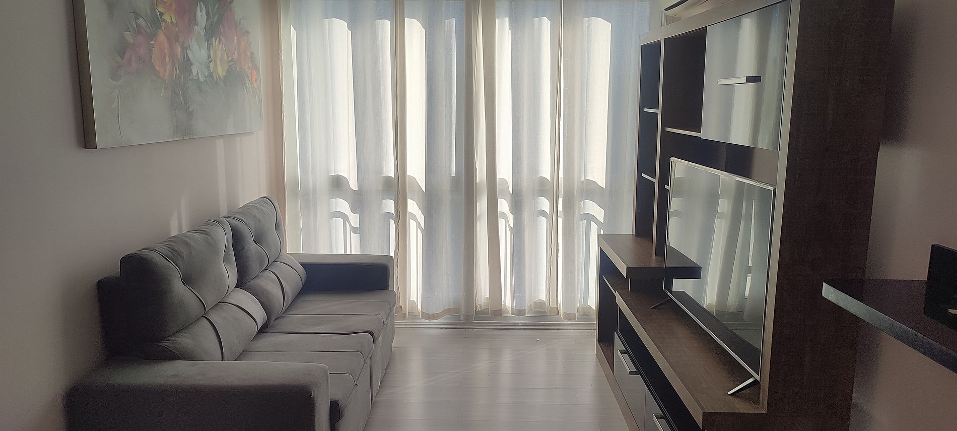 - Sala de estar com Sofá, ar-condicionado e Smart TV;