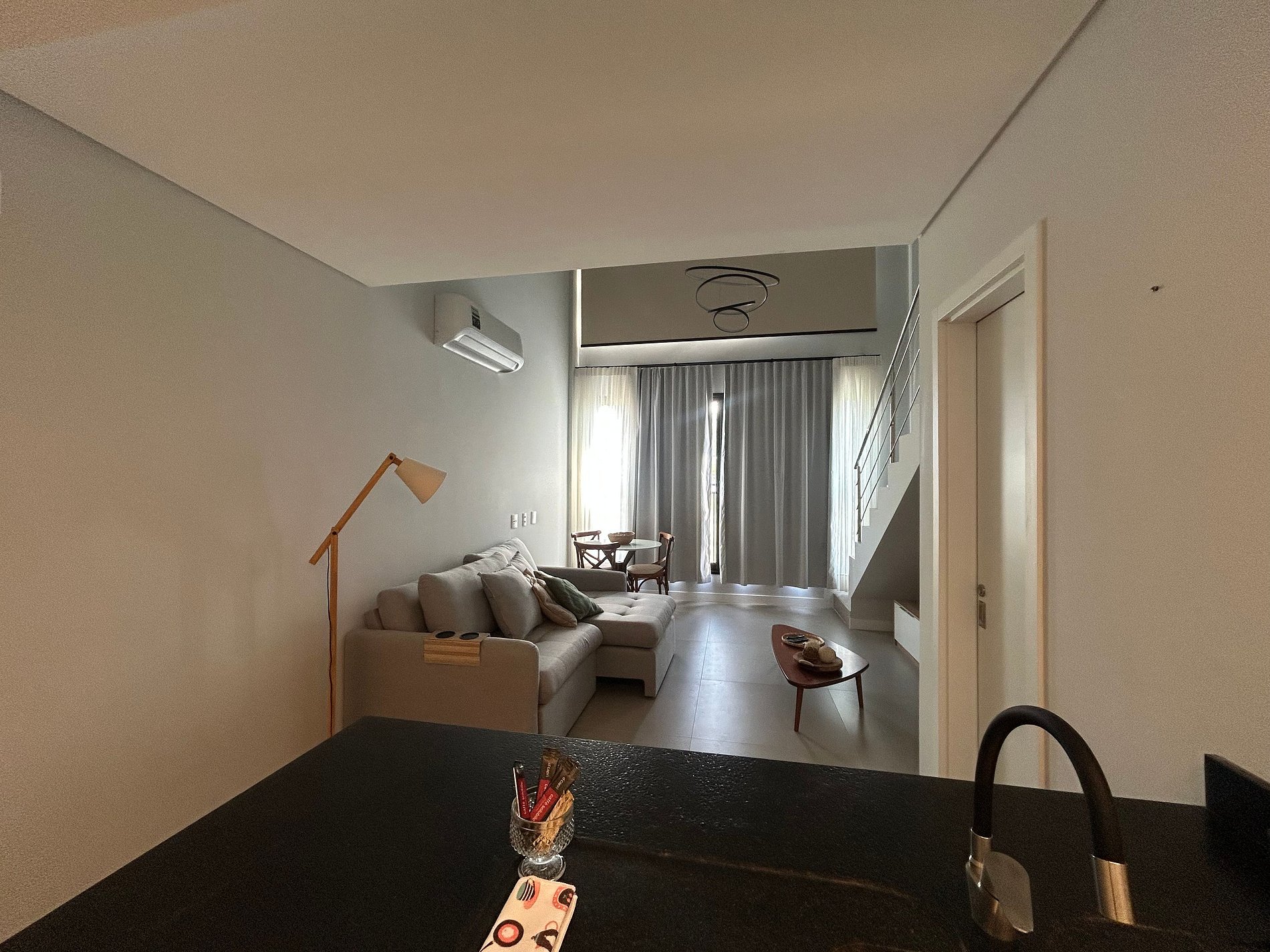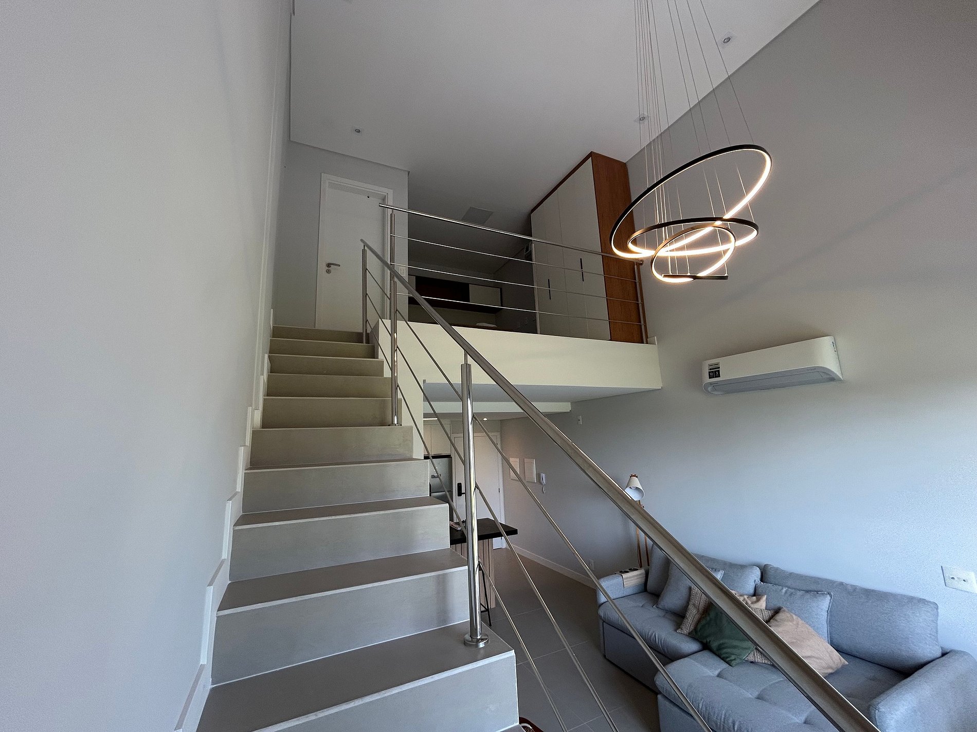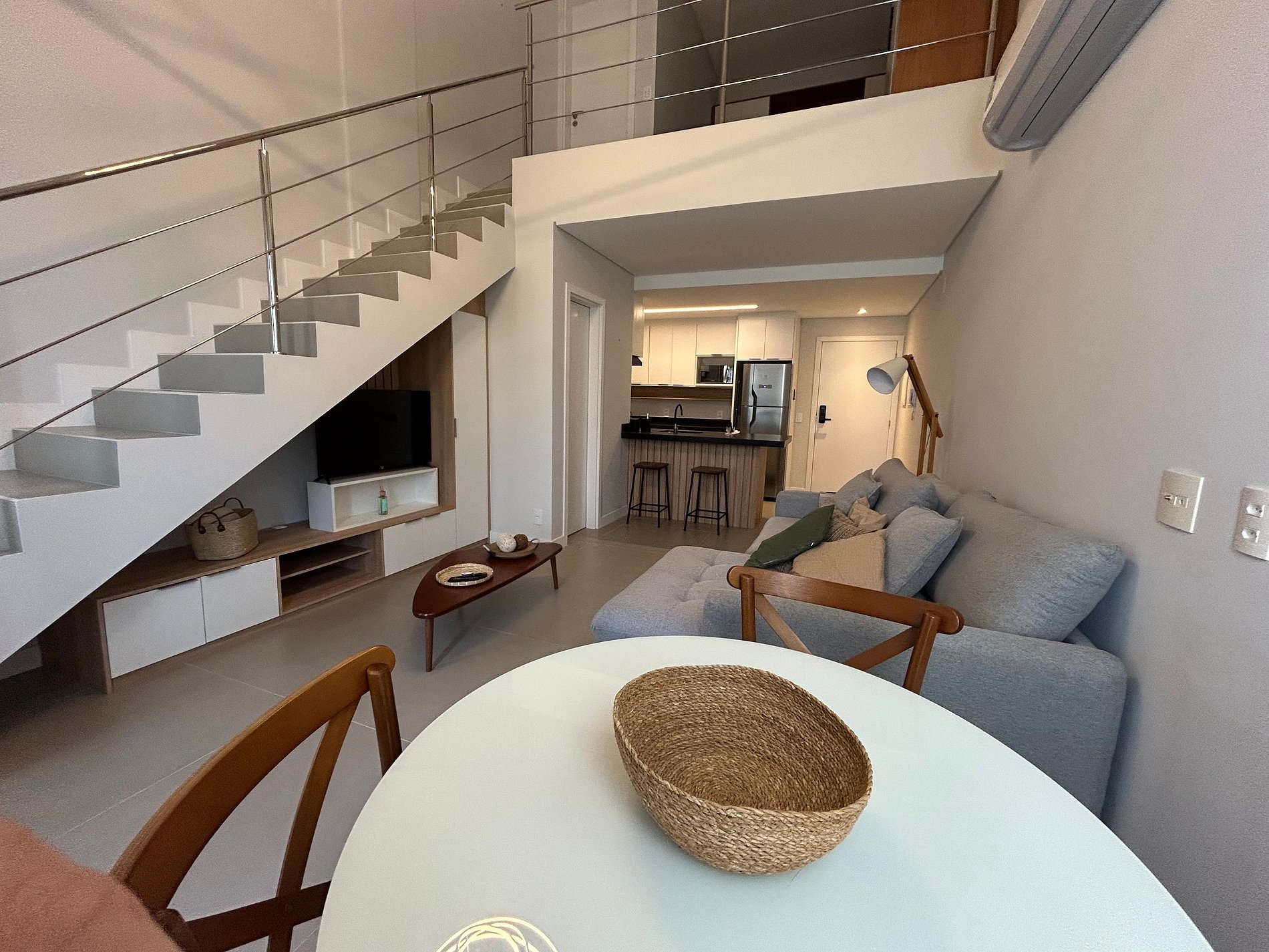 Apto de arquitetura moderna, com pé-direito duplo, excelente iluminação natural e ambientes bem distribuídos. Oferece quarto no mezzanino climatizado, sala com sofá-cama e Smart TV, cozinha completa, mesa para refeições e máquina de lavar e secar. Garagem coberta e Wi-Fi complementam a experiência. Localizado em área estratégica do Campeche, com fácil acesso à praia, mercados e cafés.