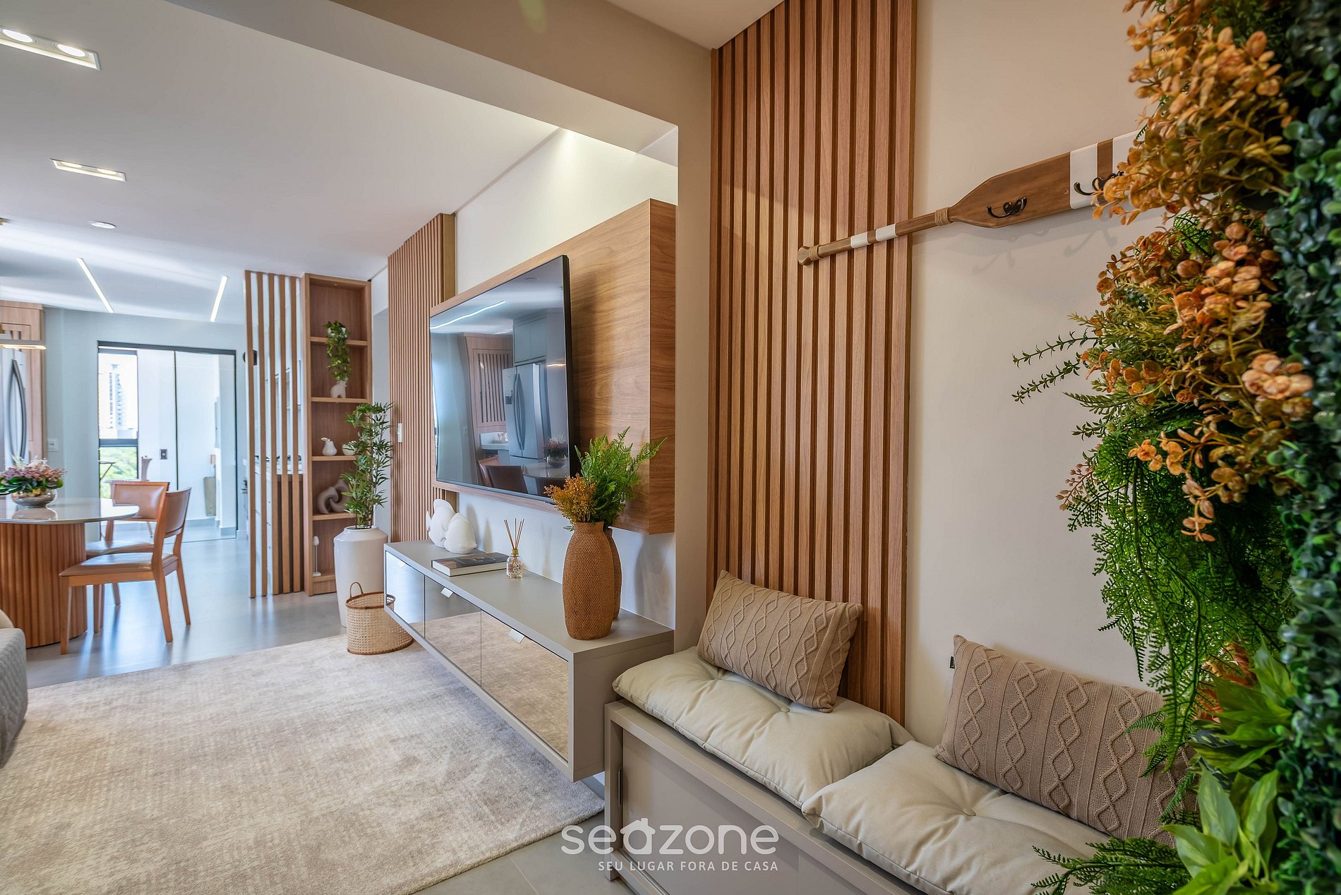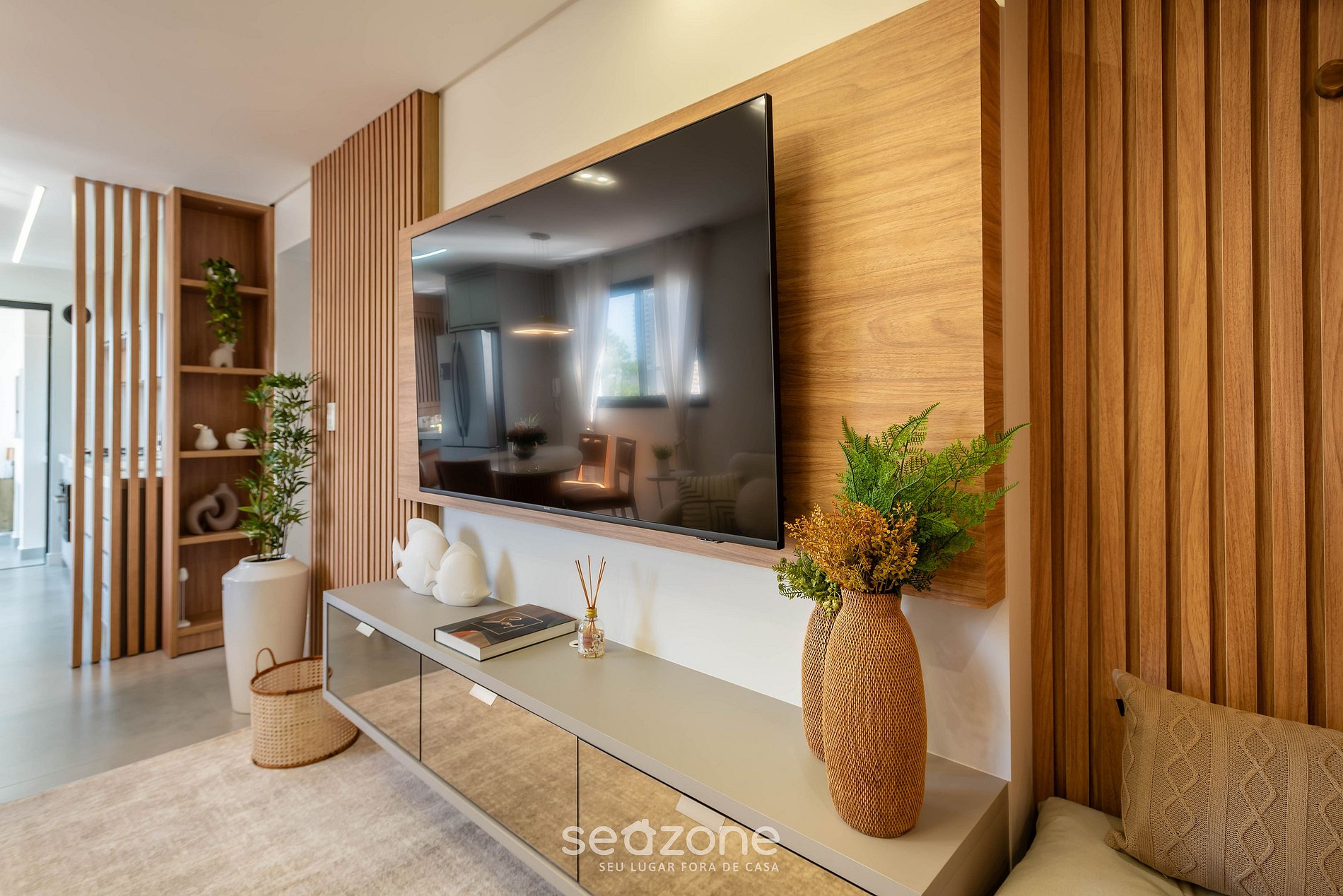 - Sala de estar com sofá, Smart Tv, armário e ar-condicionado;