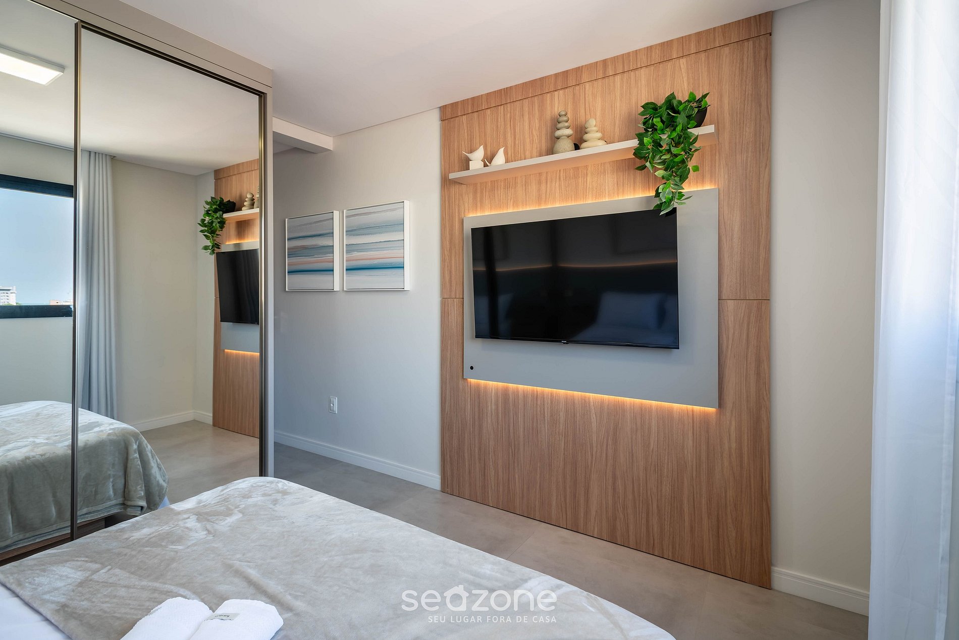 - 1 Quarto com cama de casal, Smart Tv, armário e ar-condicionado;