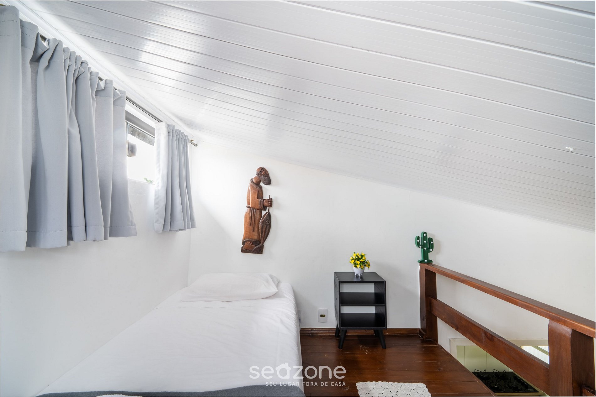 - Mezanino com cama de solteiro, arara para roupas e ventilador portátil;
