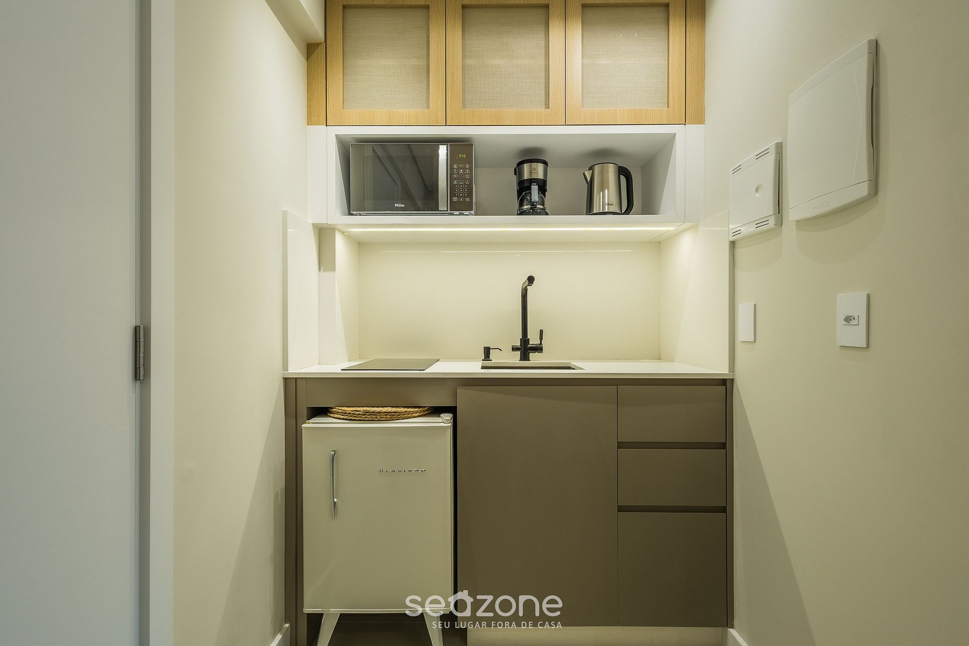 - Cozinha completa com frigobar, cooktop (indução), micro-ondas, sanduicheira, cafeteira elétrica, chaleira, liquidificador, taças de vinho, panelas, louças e utensílios;