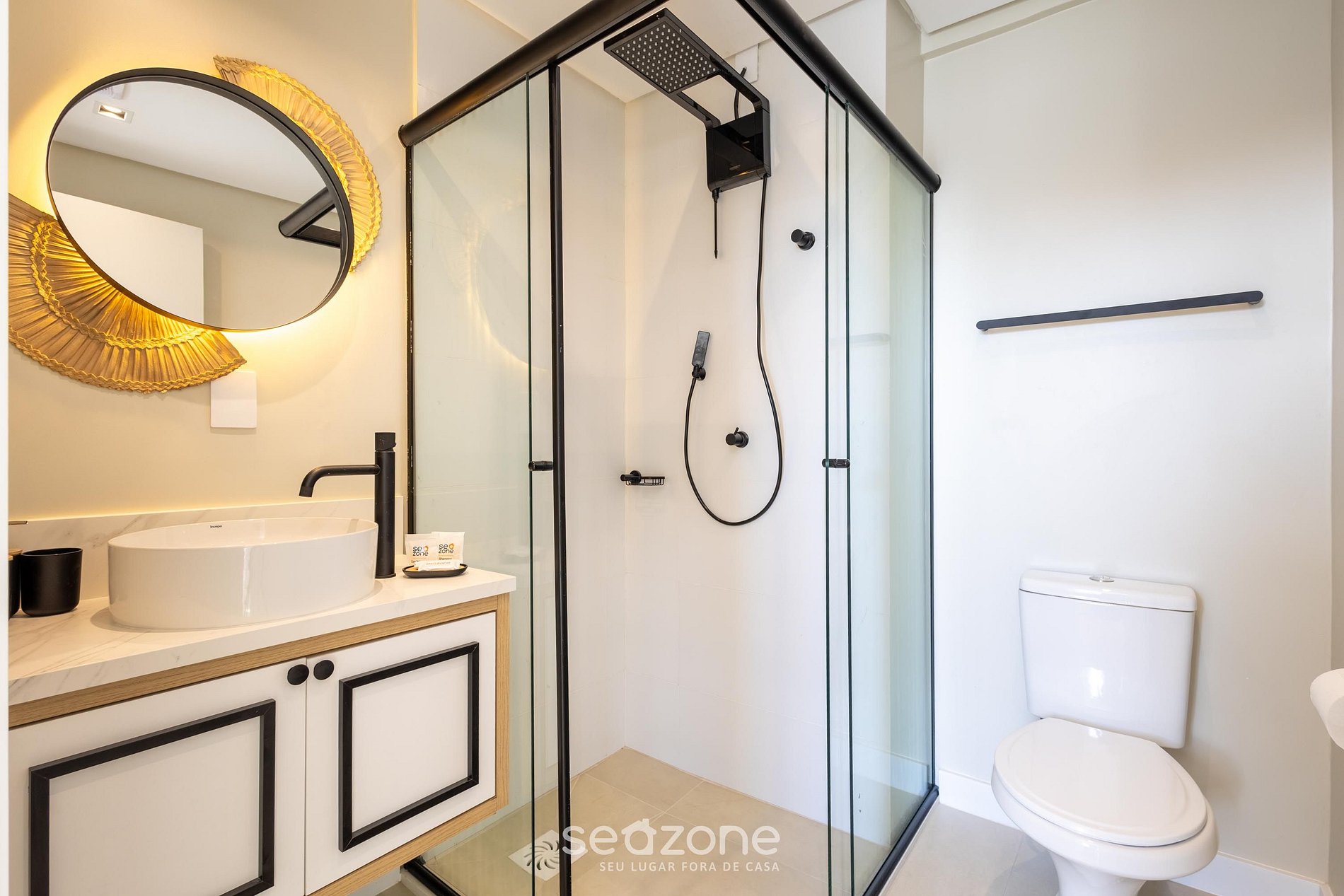 Studio moderno, bem distribuído e iluminado, com cama queen, sofá-cama, Smart TV, ar-condicionado e Wi-Fi. A cozinha completa e o espaço para refeições garantem conforto durante a estadia, enquanto a varanda traz leveza ao ambiente. O prédio oferece piscina com borda infinita e espaço gourmet no rooftop. Em localização estratégica, próximo à Lagoa de Ibiraquera, praias do Rosa e Surfland.