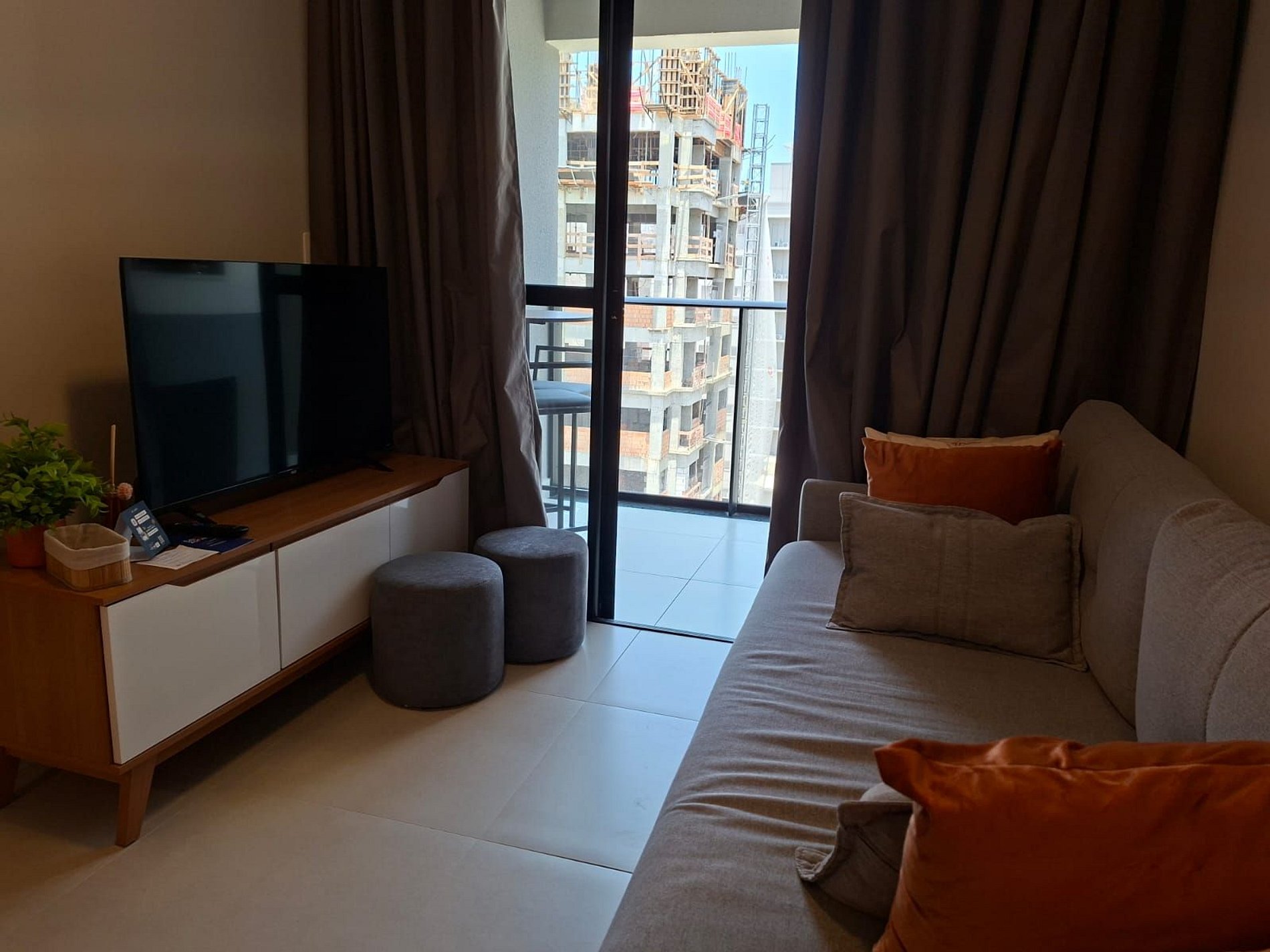 - Sala de estar com Sofá, Smart TV e ventilador de teto;