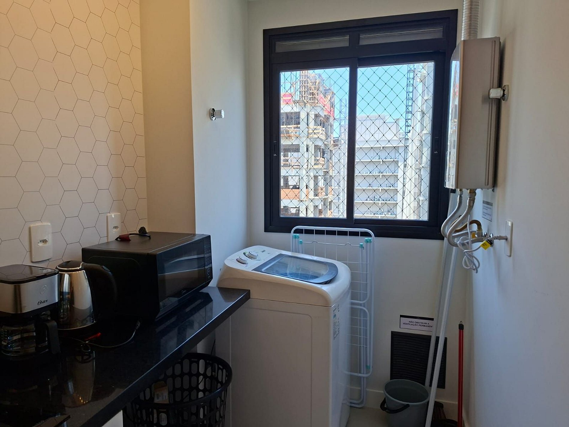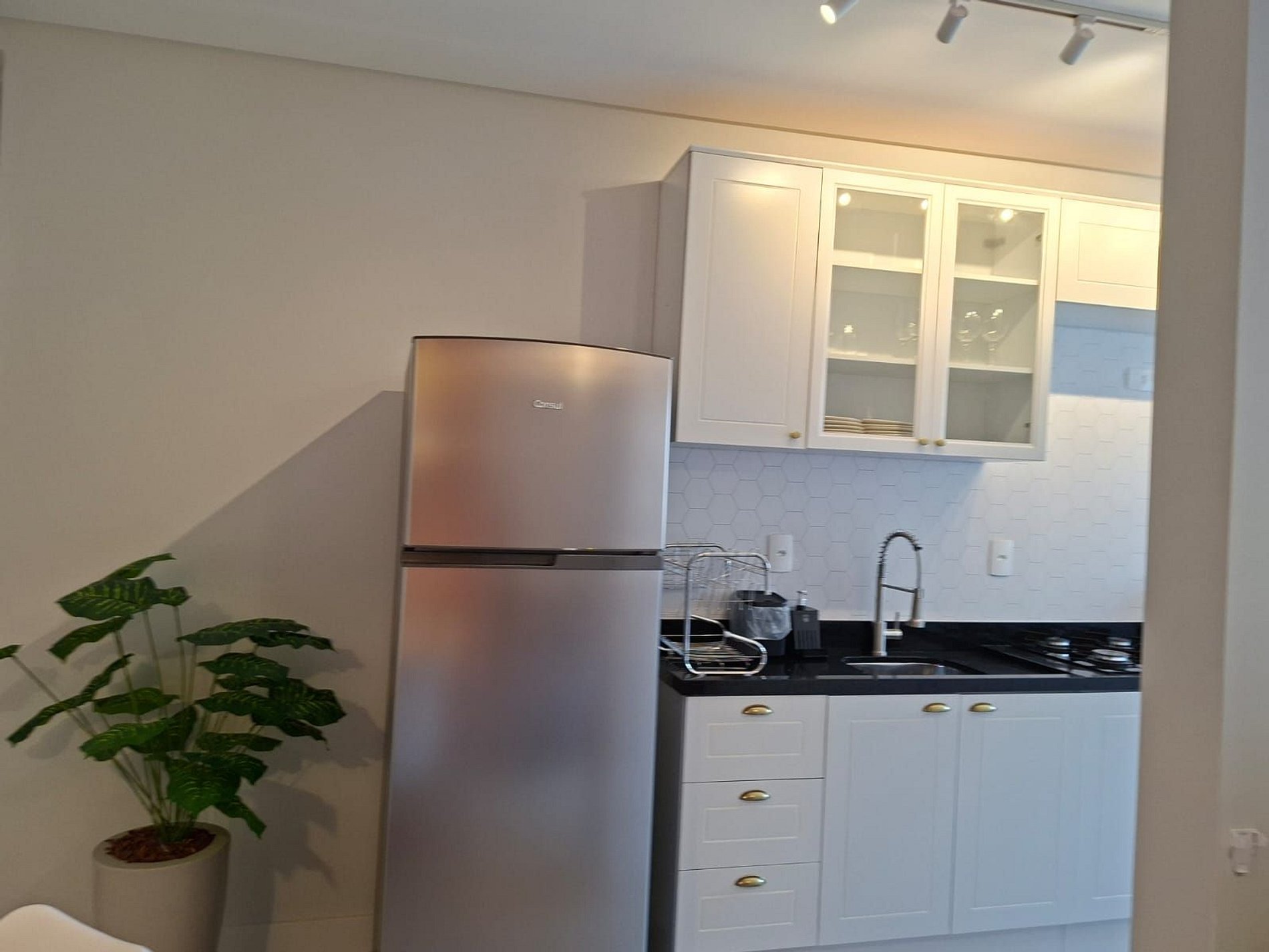 - Cozinha completa com geladeira, fogão cooktop a gás, micro-ondas, sanduicheira, cafeteira elétrica, chaleira elétrica, liquidificador, taças de vinho, panelas, louças e utensílios;