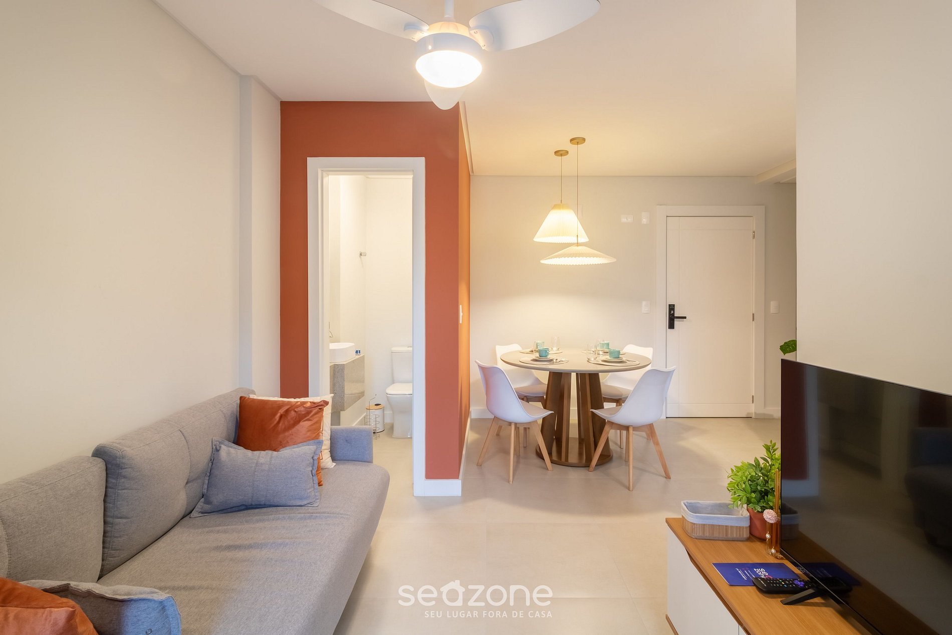 - Sala de estar com Sofá, Smart TV e ventilador de teto;