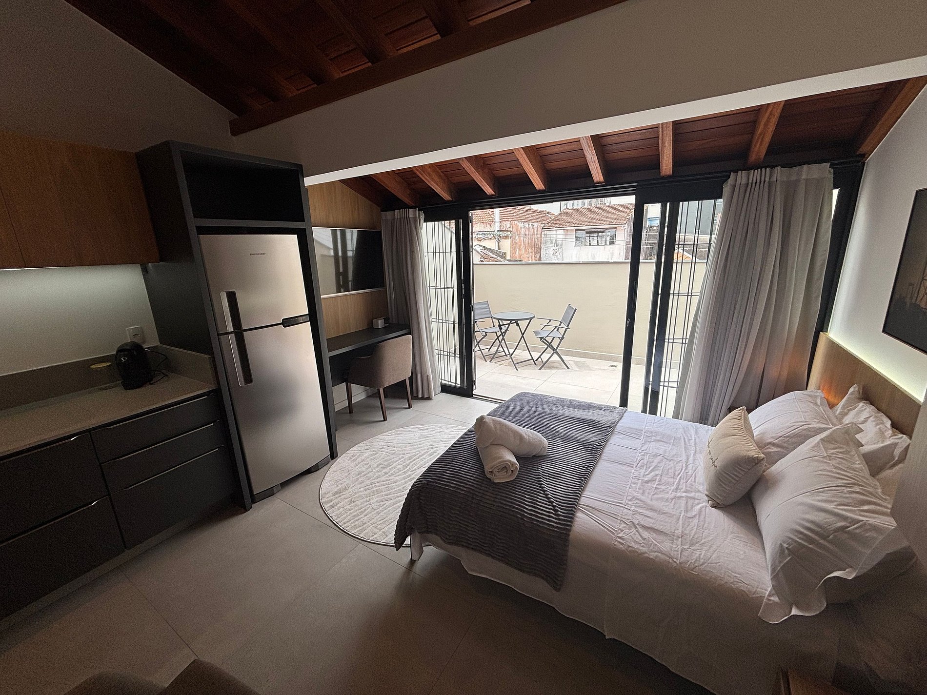 Este studio oferece uma estadia moderna e funcional, com acabamentos de alto padrão e iluminação acolhedora. Conta com cama de casal confortável, Smart TV, ar-condicionado, bancada de trabalho, armário e cozinha equipada. A sacada privativa amplia o conforto e traz leveza ao ambiente. Localizado no Centro de Florianópolis, com fácil acesso à orla, comércio e áreas culturais.
