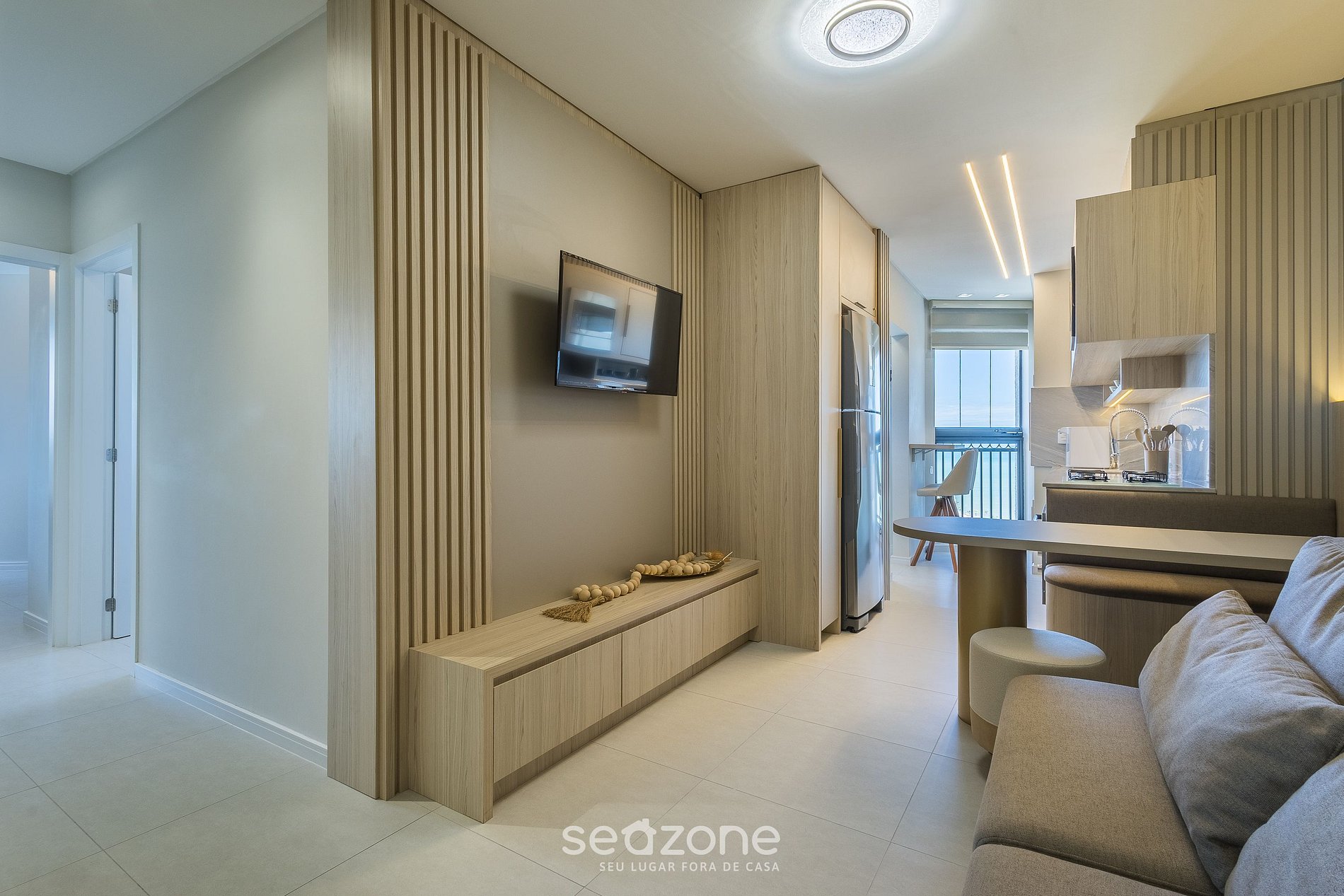 - Sala de estar com sofá, Smart TV e ar-condicionado;