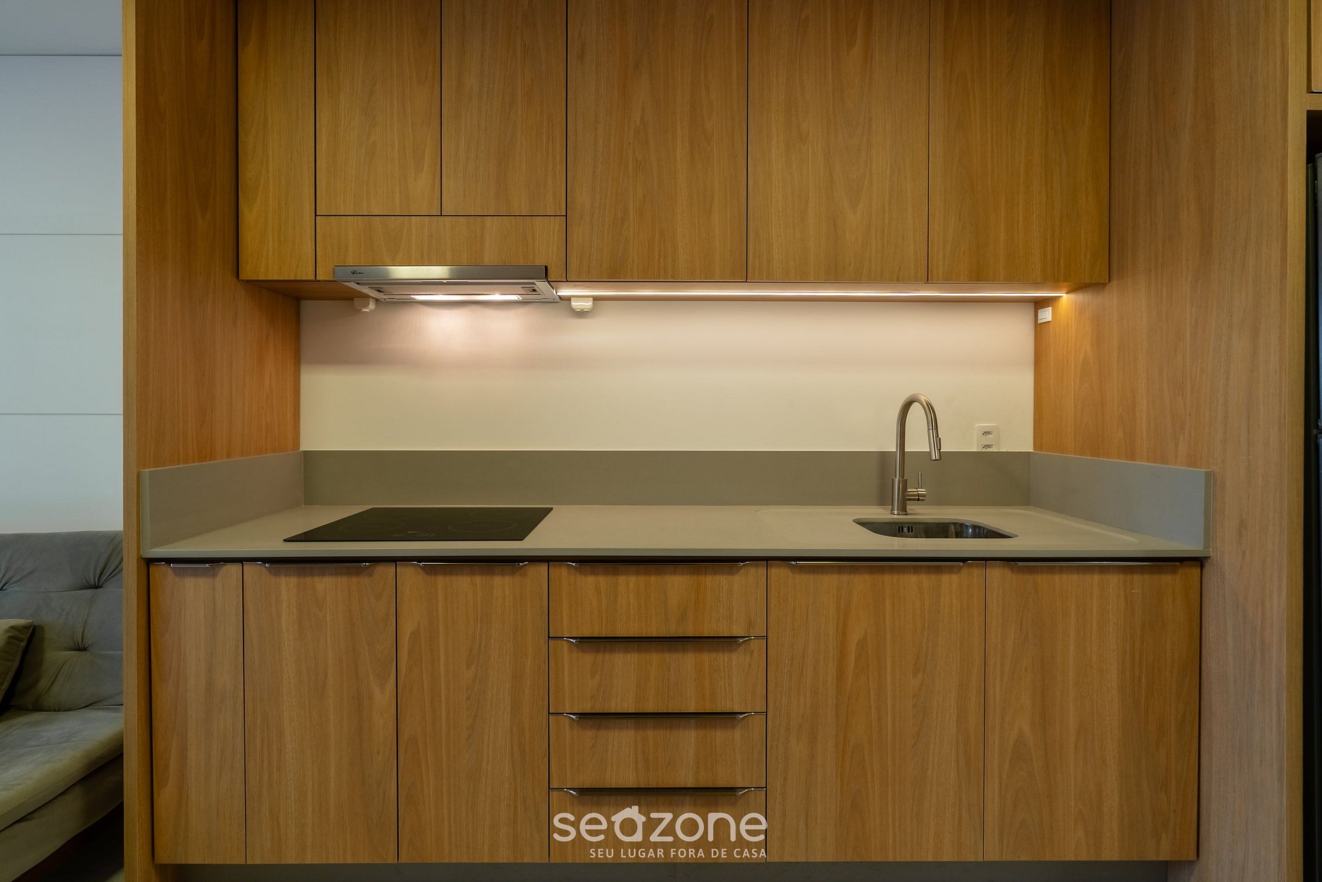 - Cozinha completa com geladeira, fogão cooktop (indução), forno elétrico, micro-ondas, liquidificador, sanduicheira, cafeteira elétrica, chaleira (caneco), taças de vinho, panelas, louças e utensílios;
