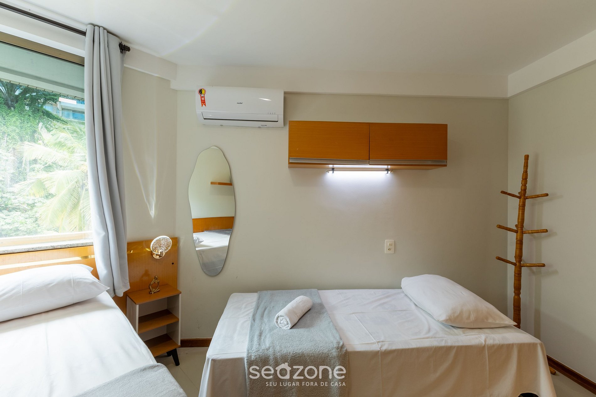 - 1 Quarto com cama de casal, cama de solteiro, cama auxiliar de solteiro, armário, mesa de cabeceira e ar-condicionado;