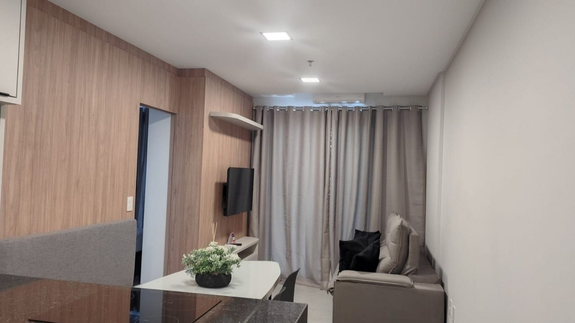- Sala com sofá, smart TV e ar-condicionado;