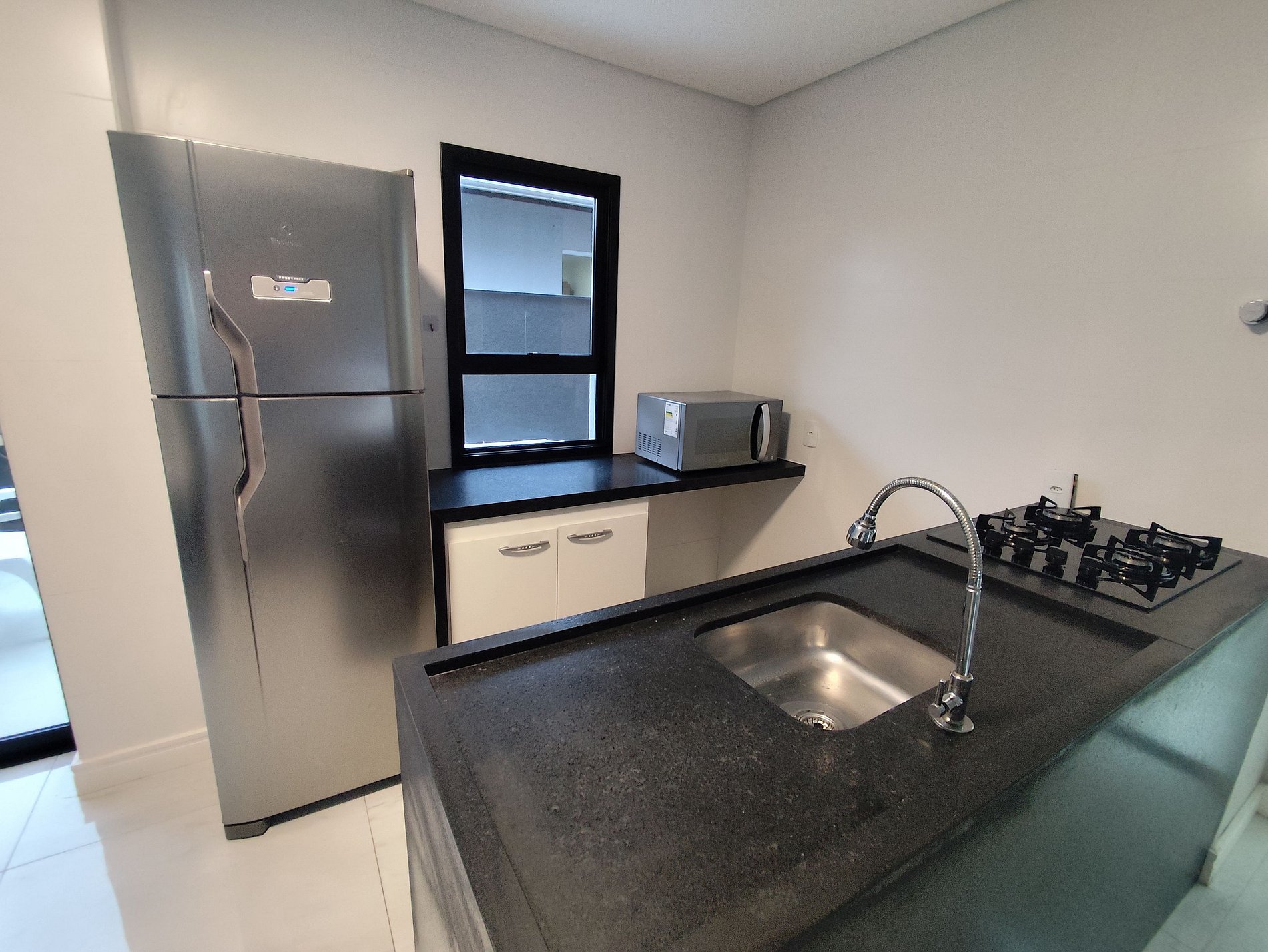 - Cozinha completa com geladeira, fogão cooktop (gás), microondas, sanduicheira, cafeteira elétrica, chaleira elétrica, liquidificador, louças e utensílios;