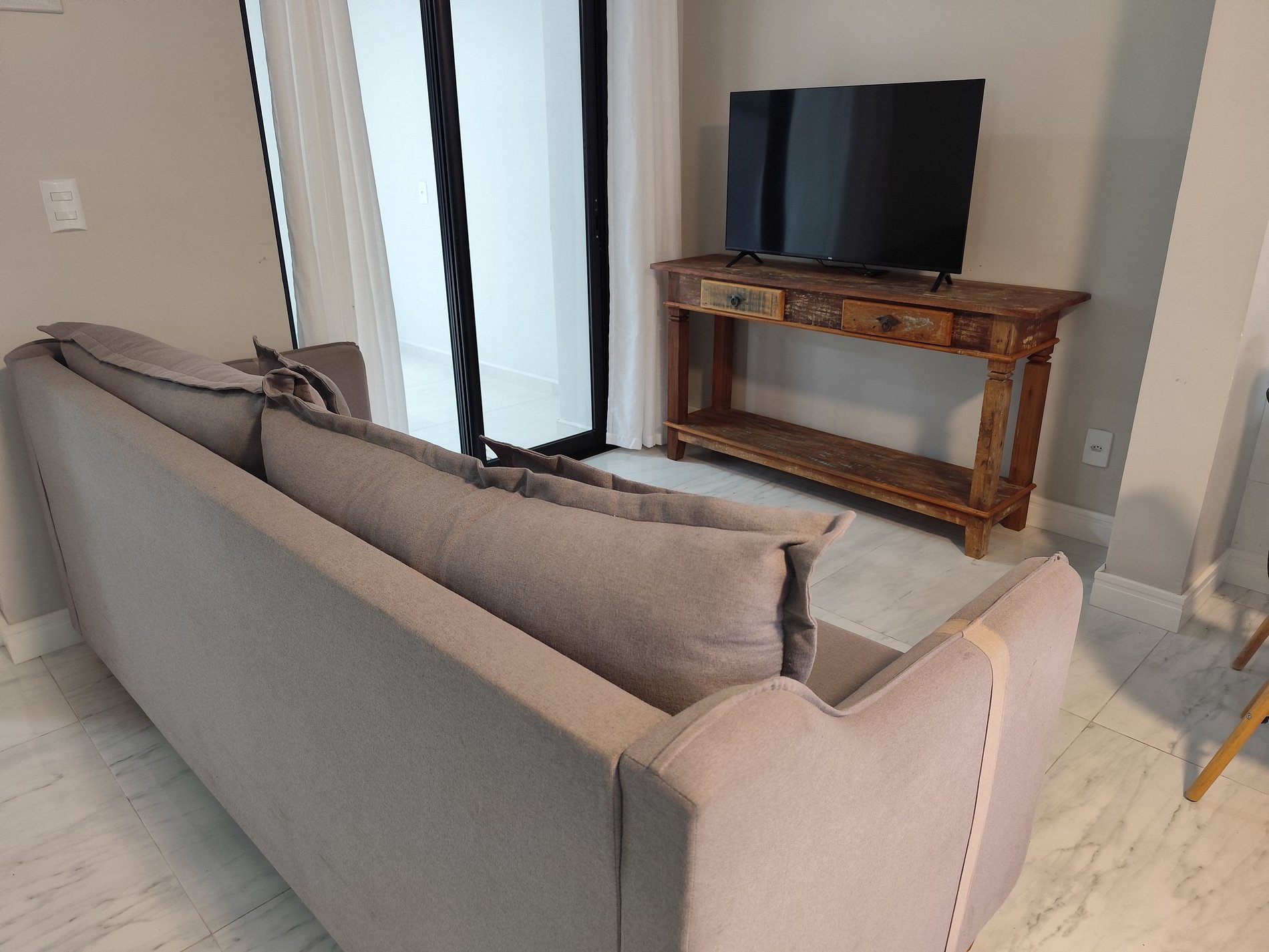 - Sala de estar com sofá, Smart TV e ventilador portátil;