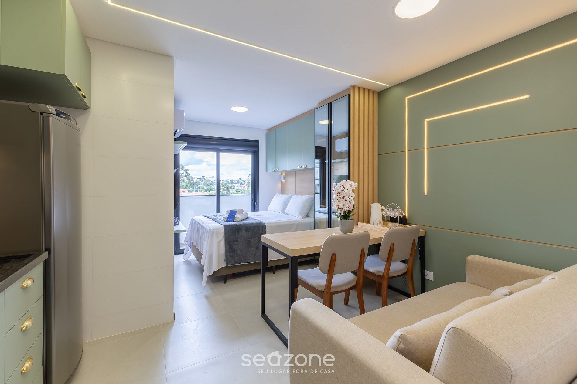 Studio moderno em uma das áreas mais consolidadas do bairro Boa Vista. Ambientes bem distribuídos com cama de casal, sofá-cama, climatização, Smart TV e cozinha totalmente equipada. Espaço para refeições, Wi-Fi e enxoval de padrão hoteleiro elevam o conforto. Condomínio com academia e lavanderia. Próximo ao Cabral, mercados tradicionais e acesso facilitado ao Centro.