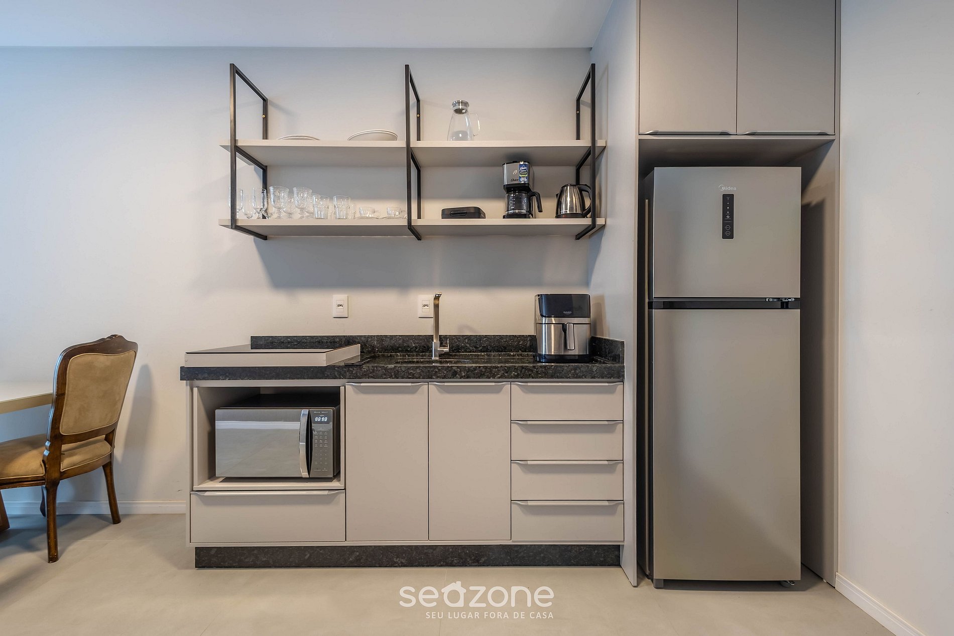 - Cozinha completa com geladeira, fogão cooktop por indução, micro-ondas, Airfryer, sanduicheira, liquidificador, cafeteira elétrica, chaleira comum, taças de vinho, panelas, louças e utensílios;