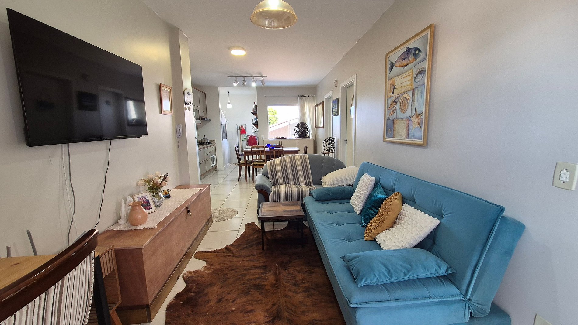- Sala de estar com Sofá, Sofá-cama, Smart TV e ventilador portátil;