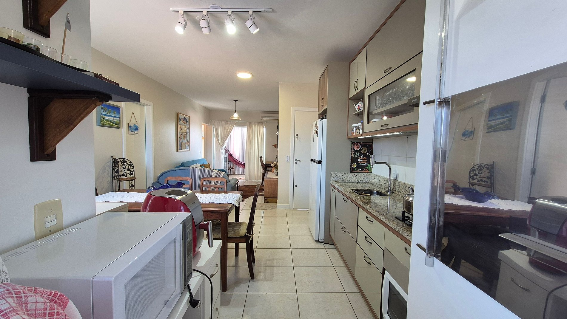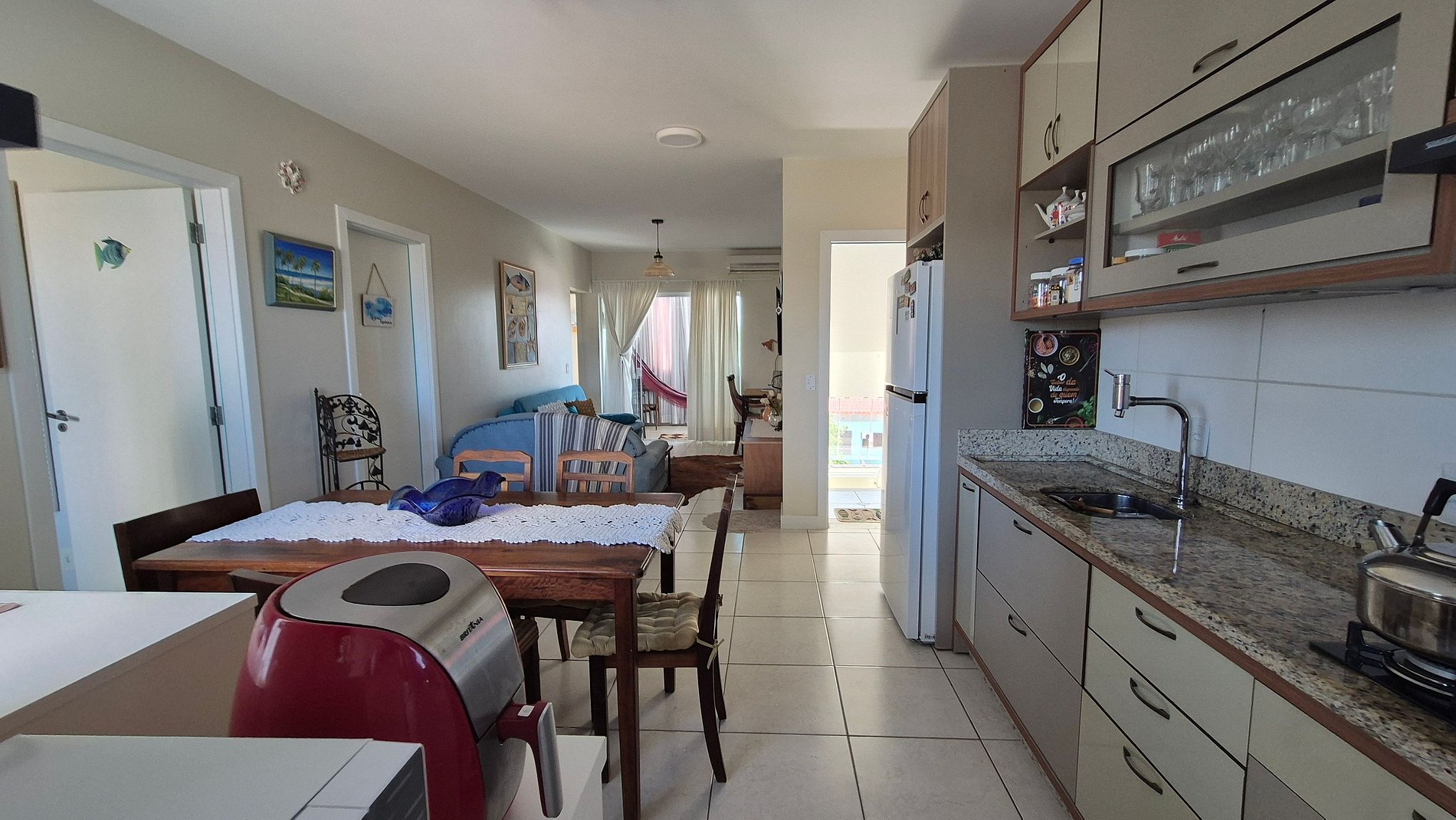- Cozinha completa com geladeira, cooktop (a gás), forno elétrico, micro-ondas, Airfryer, sanduicheira, cafeteira elétrica, Kit café (suporte para filtro, garrafa térmica), chaleira, liquidificador, taças de vinho, panelas, louças e utensílios;