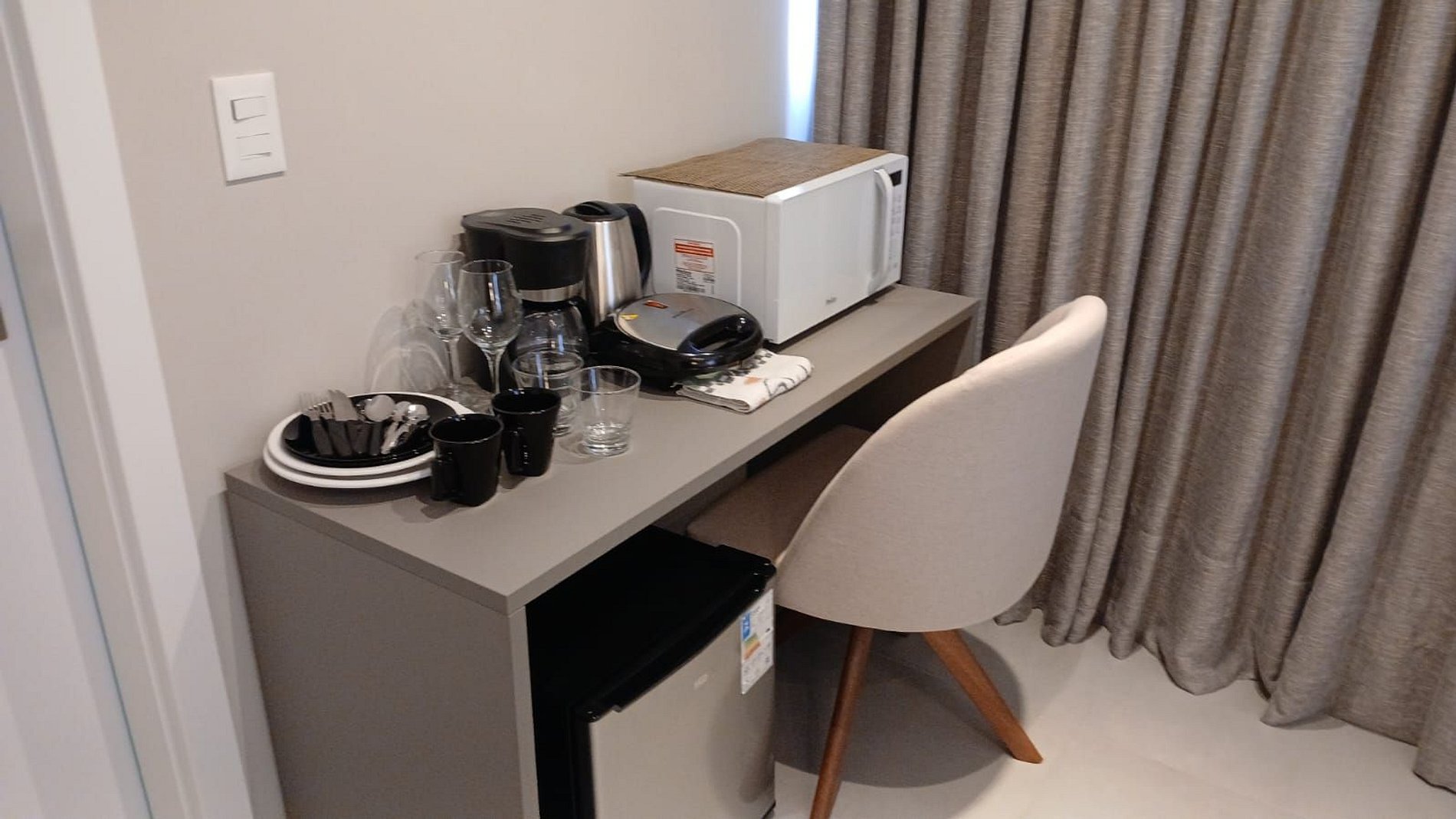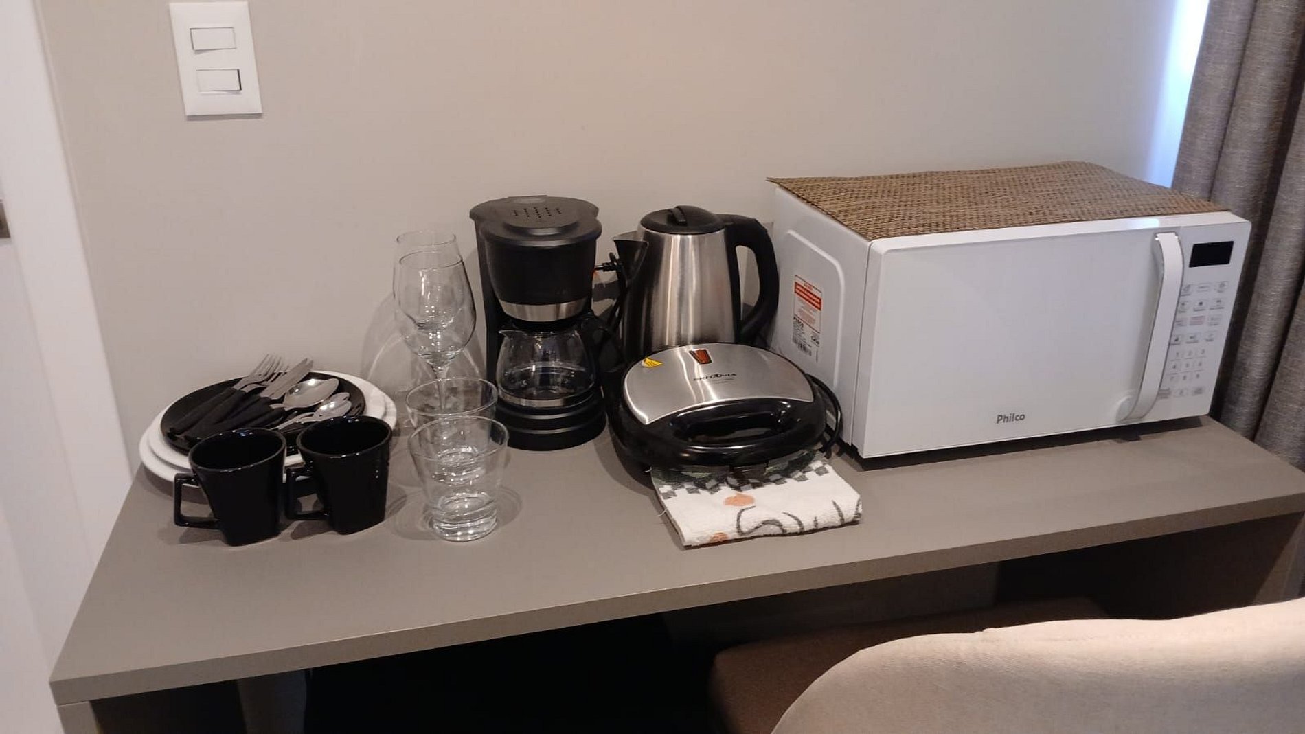 - Cozinha compacta com frigobar, micro-ondas, sanduicheira, cafeteira elétrica, chaleira elétrica, taças de vinho, panelas, louças e utensílios;