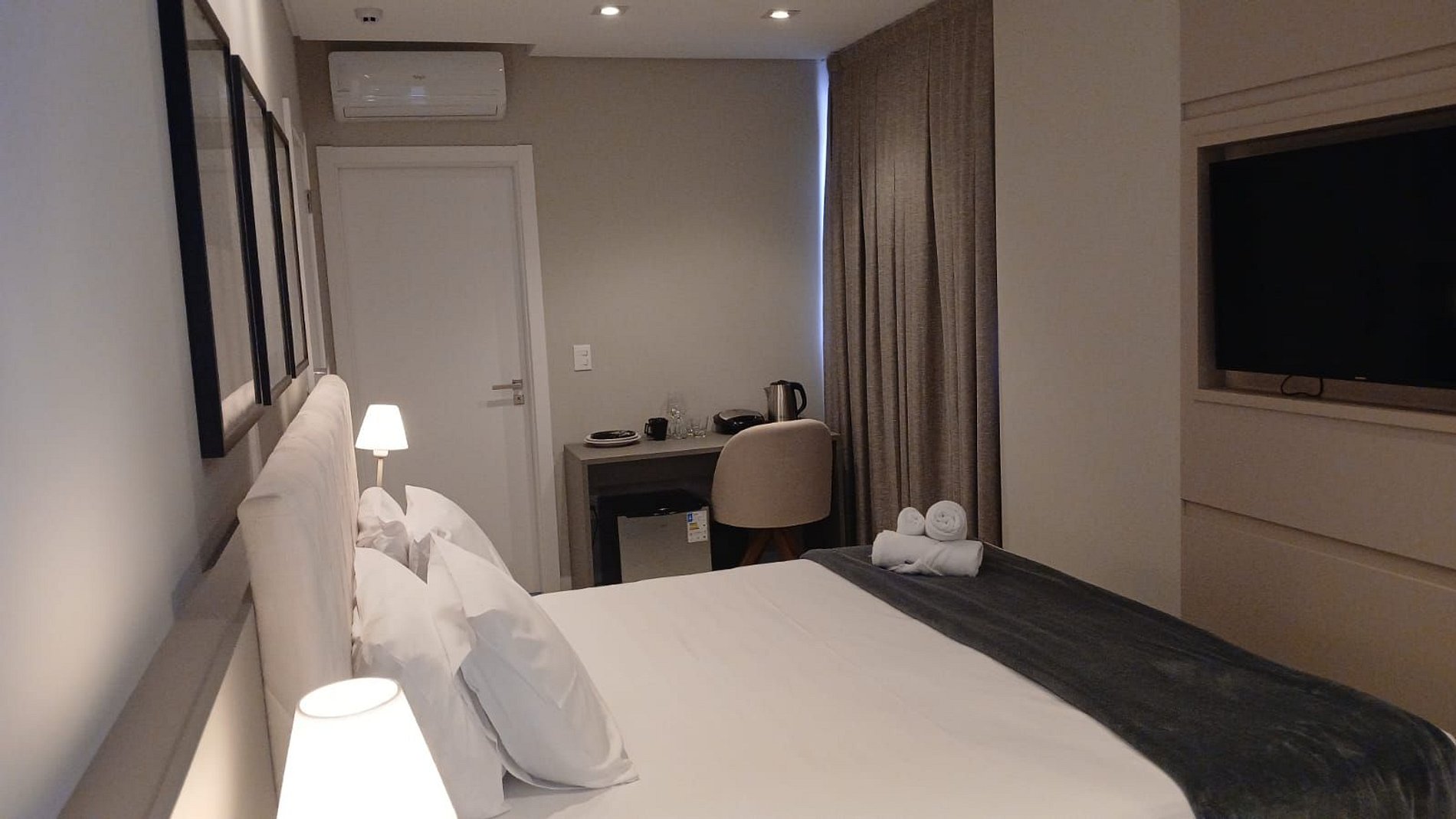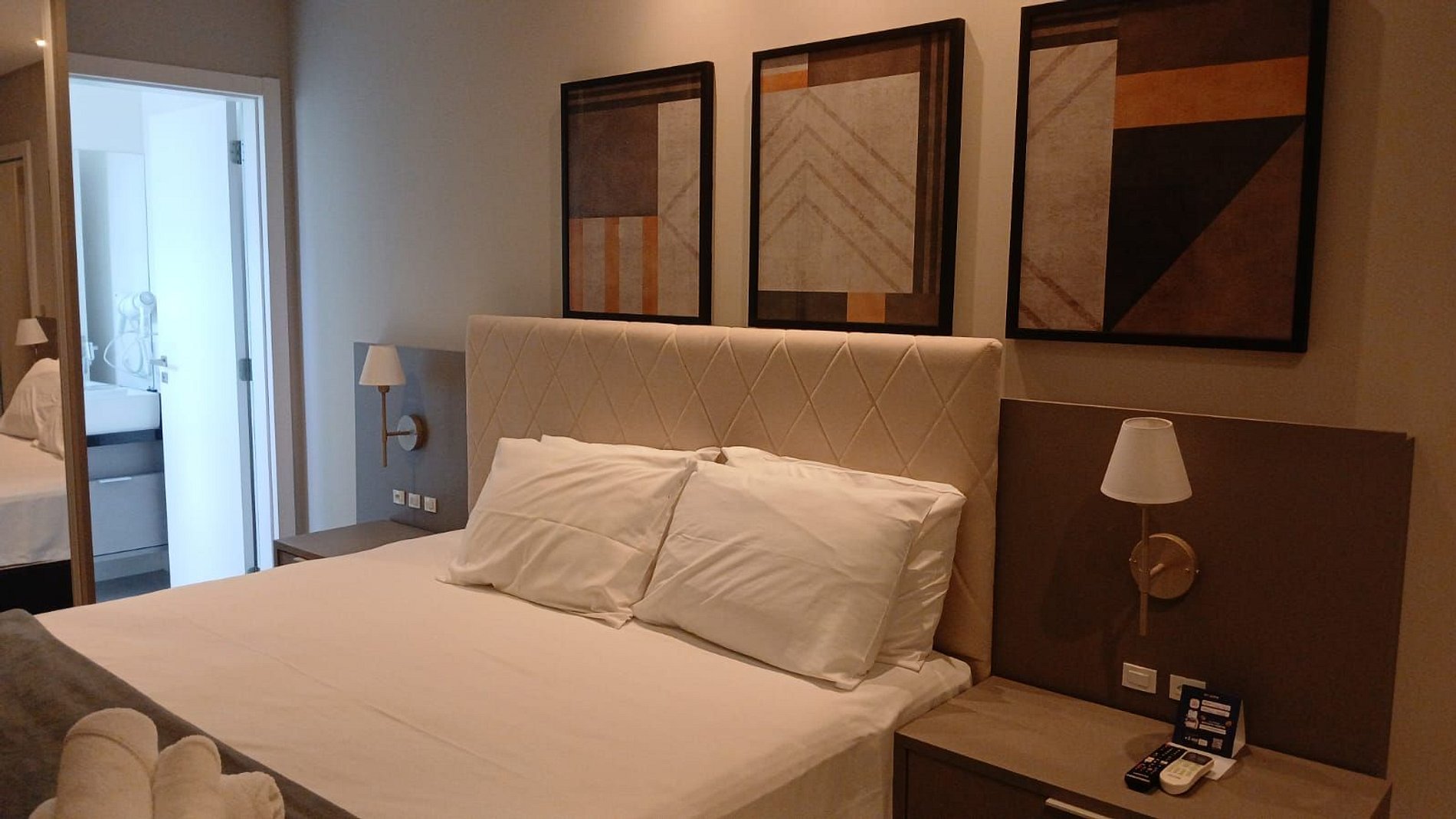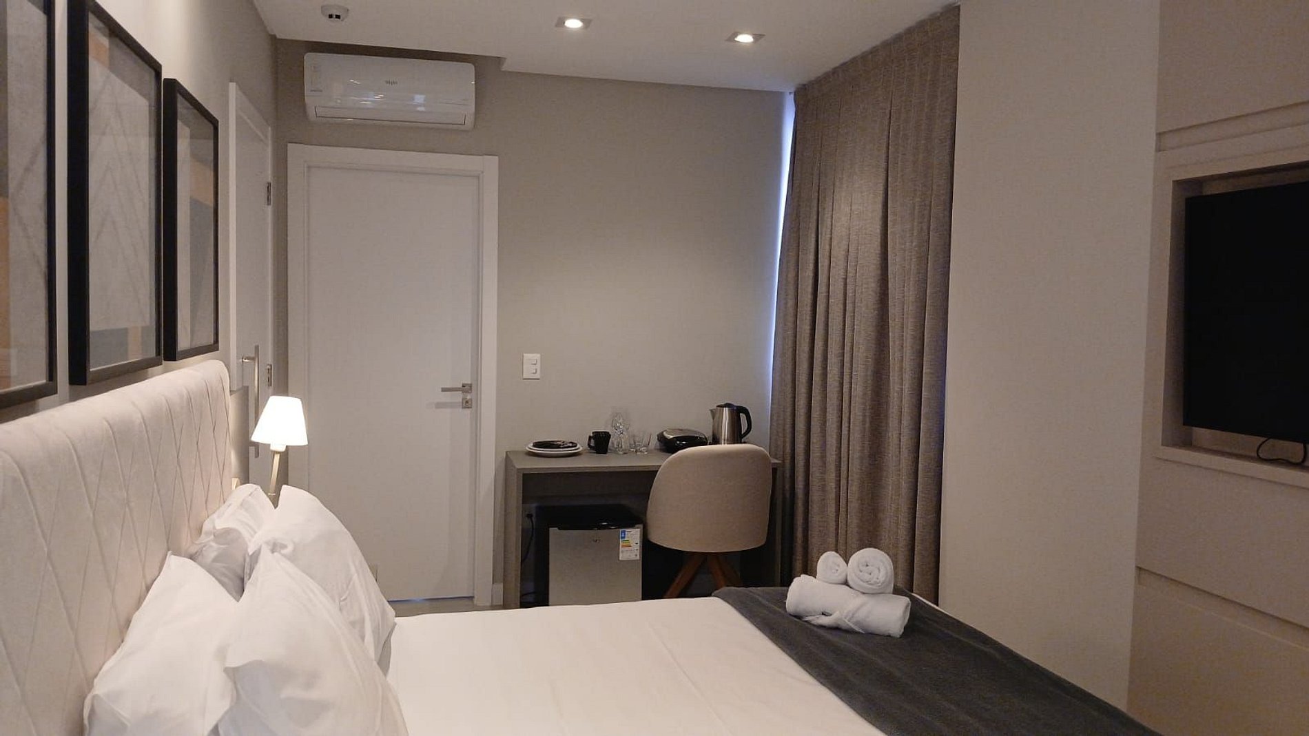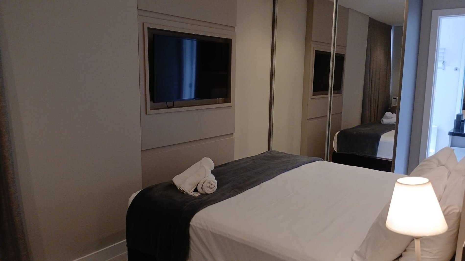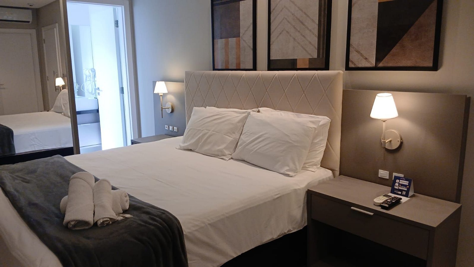 - 1 cama king size, cortinas blackout, guarda-roupa, Smart TV e ar-condicionado;