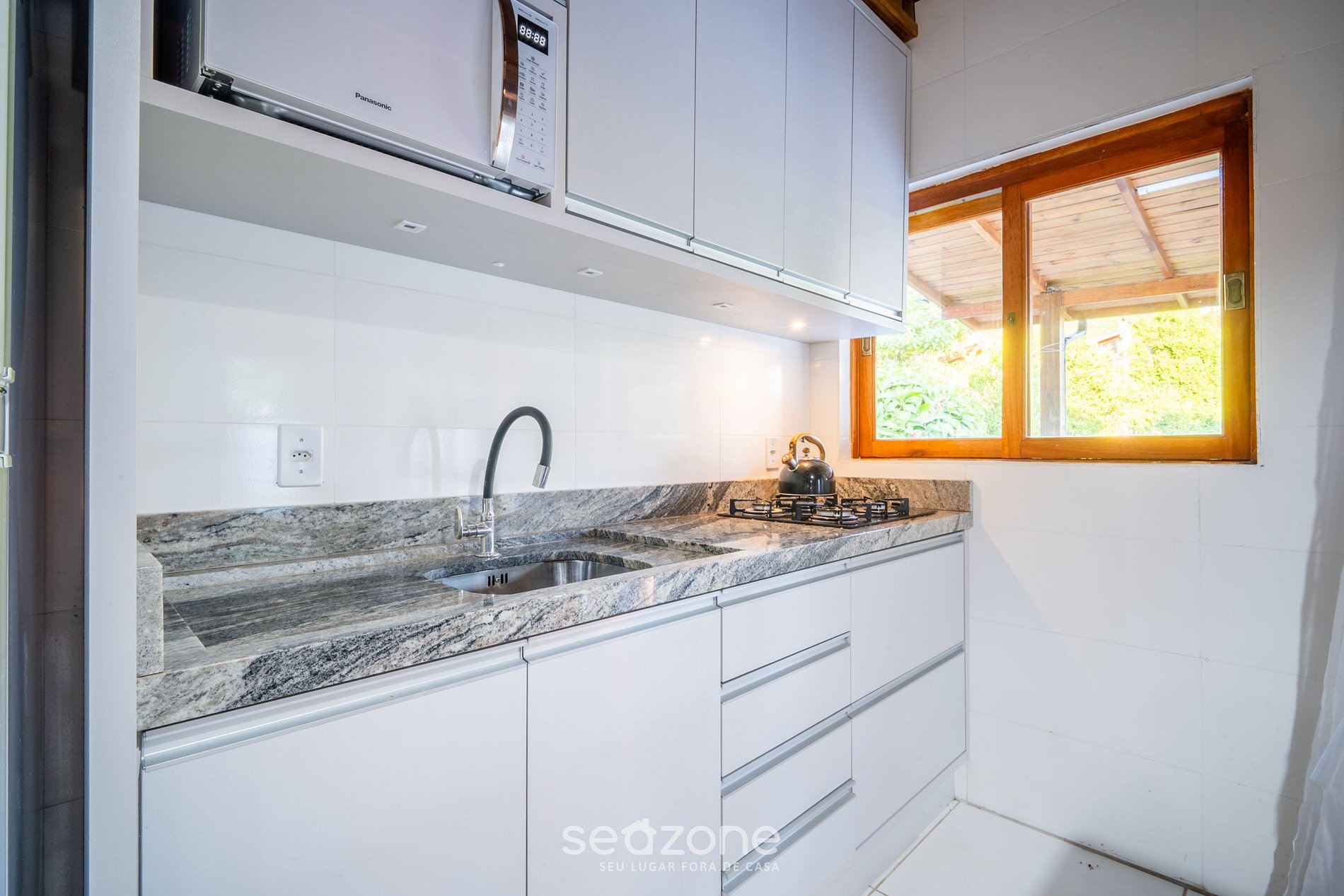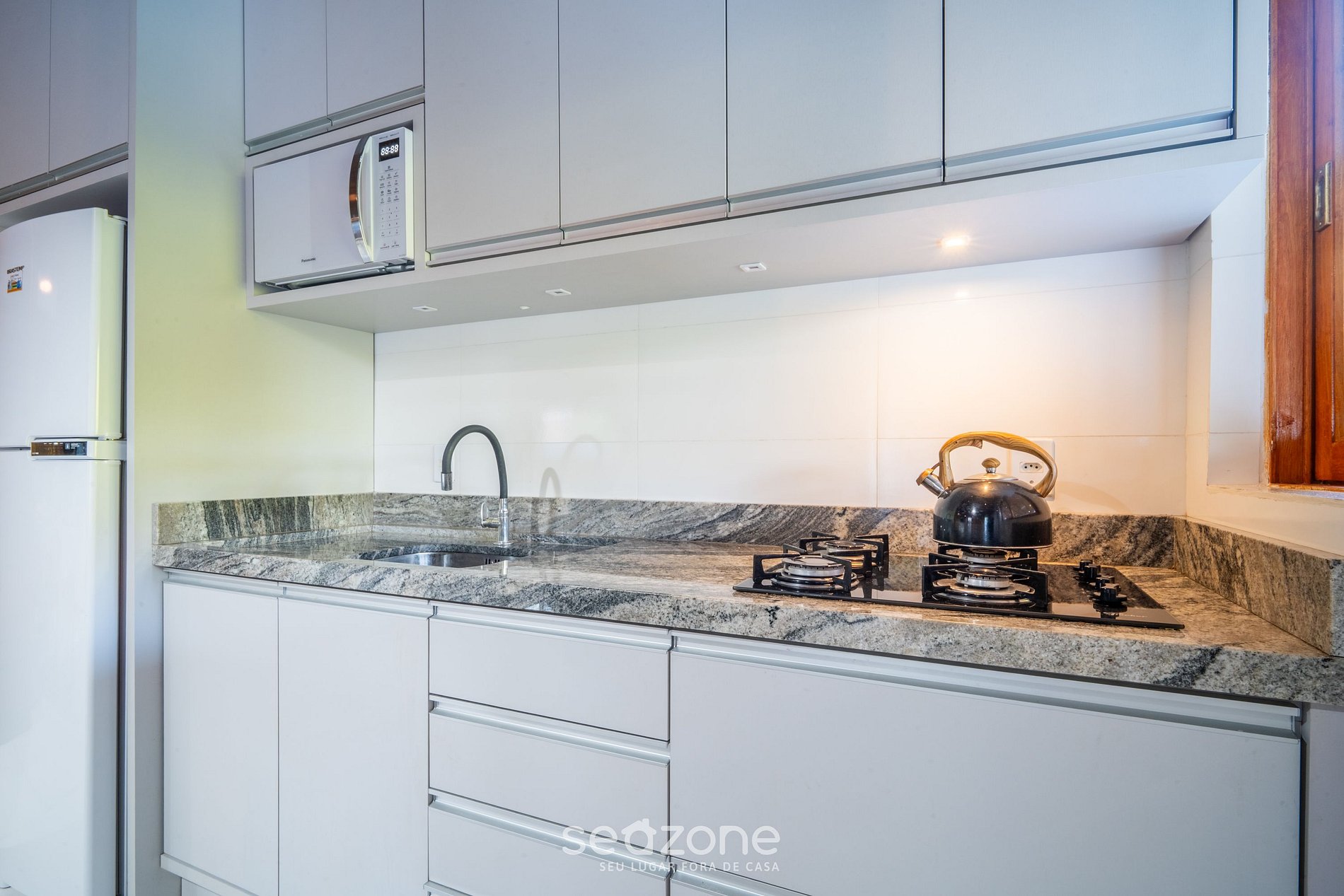 - Cozinha completa com geladeira, fogão cooktop (gás), micro-ondas, sanduicheira, Kit café (suporte para filtro, garrafa térmica), chaleira, liquidificador, taças de vinho, panelas, louças e utensílios;