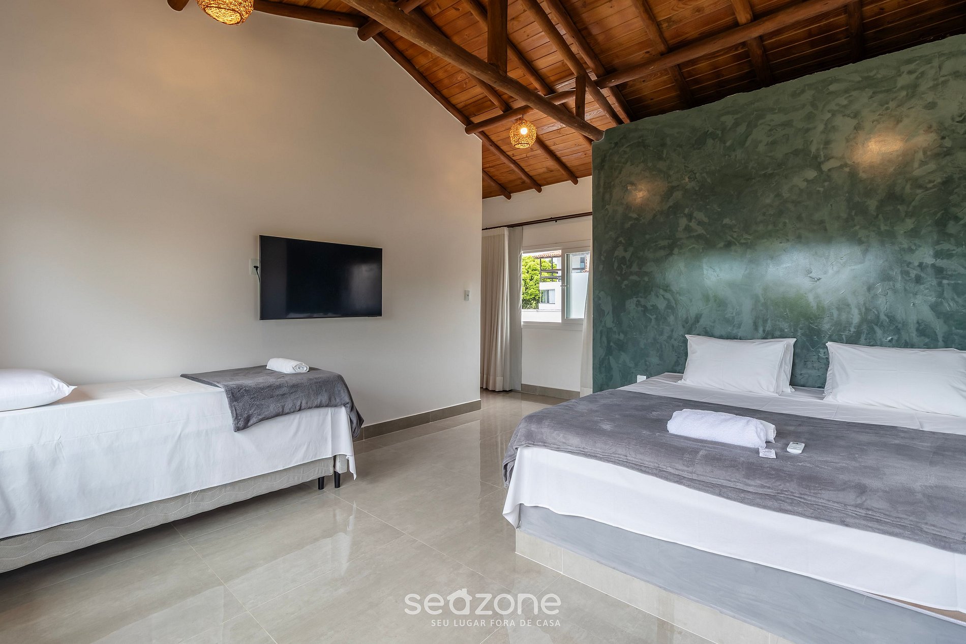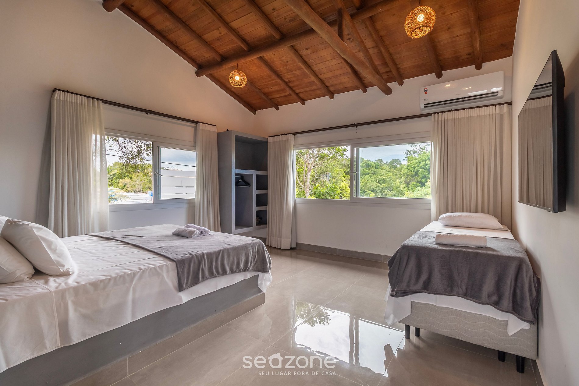 - 1 Suíte com 1 cama King, 1 cama de solteiro, 1 cama auxiliar de solteiro, arara para roupas e ar-condicionado; (andar superior);