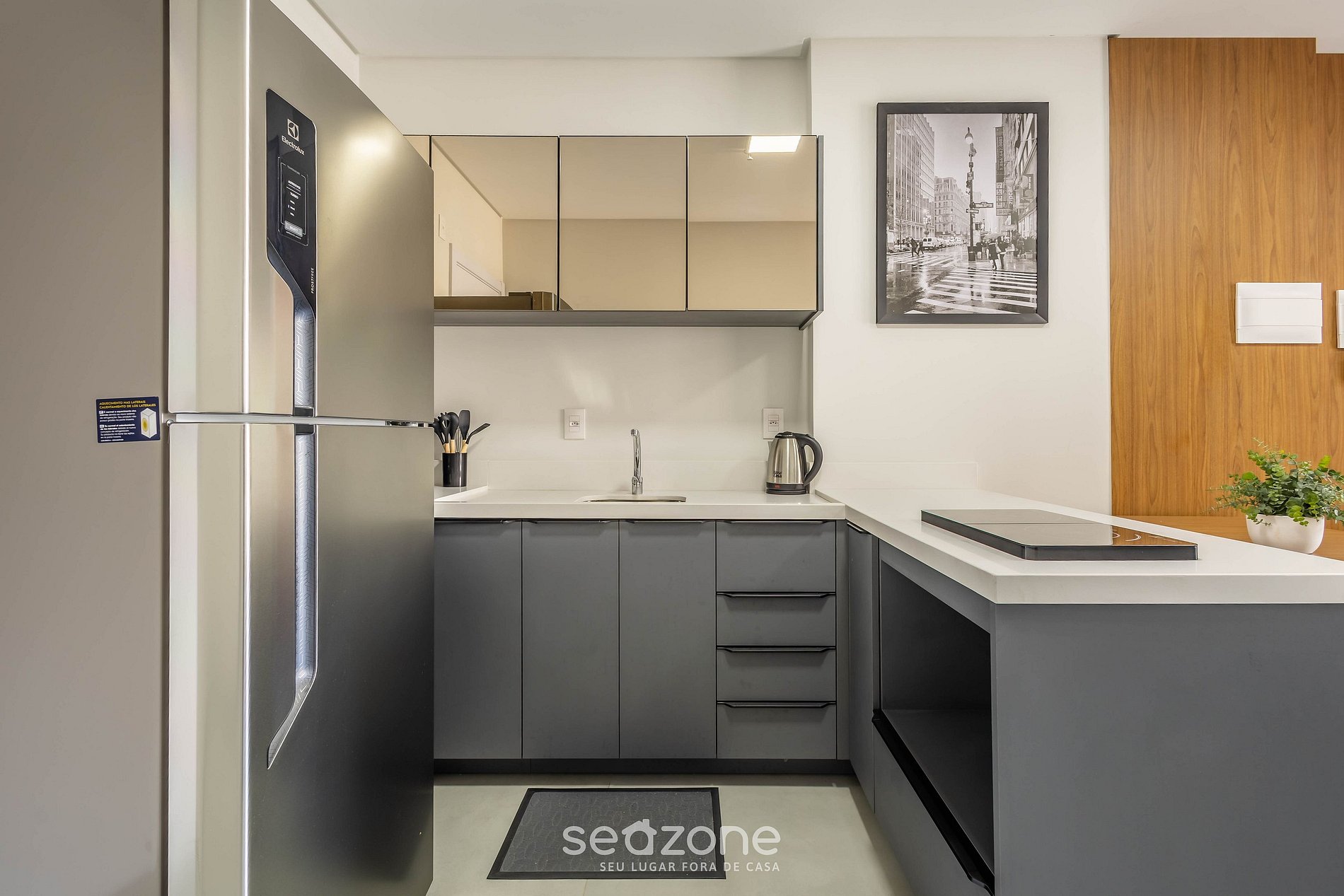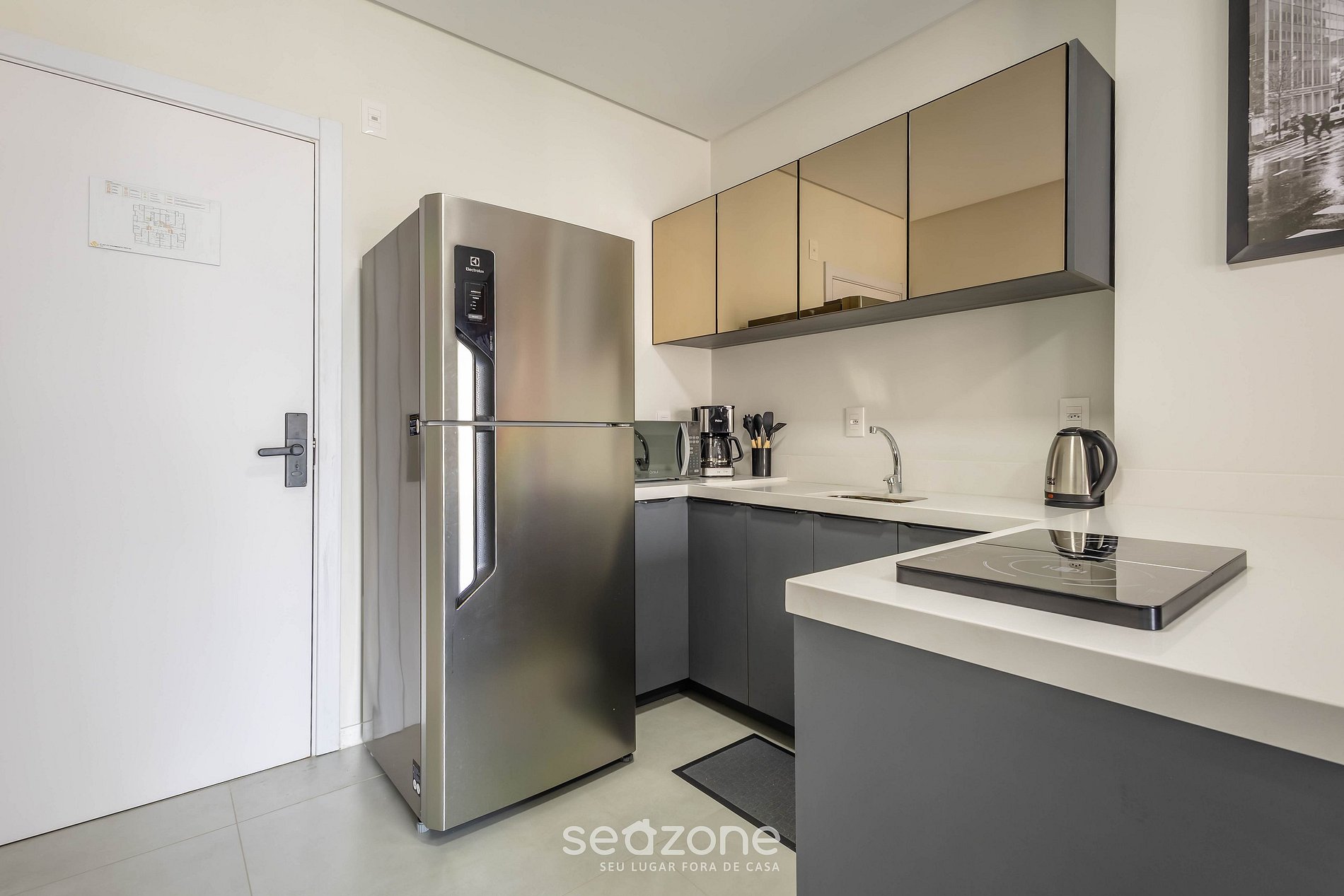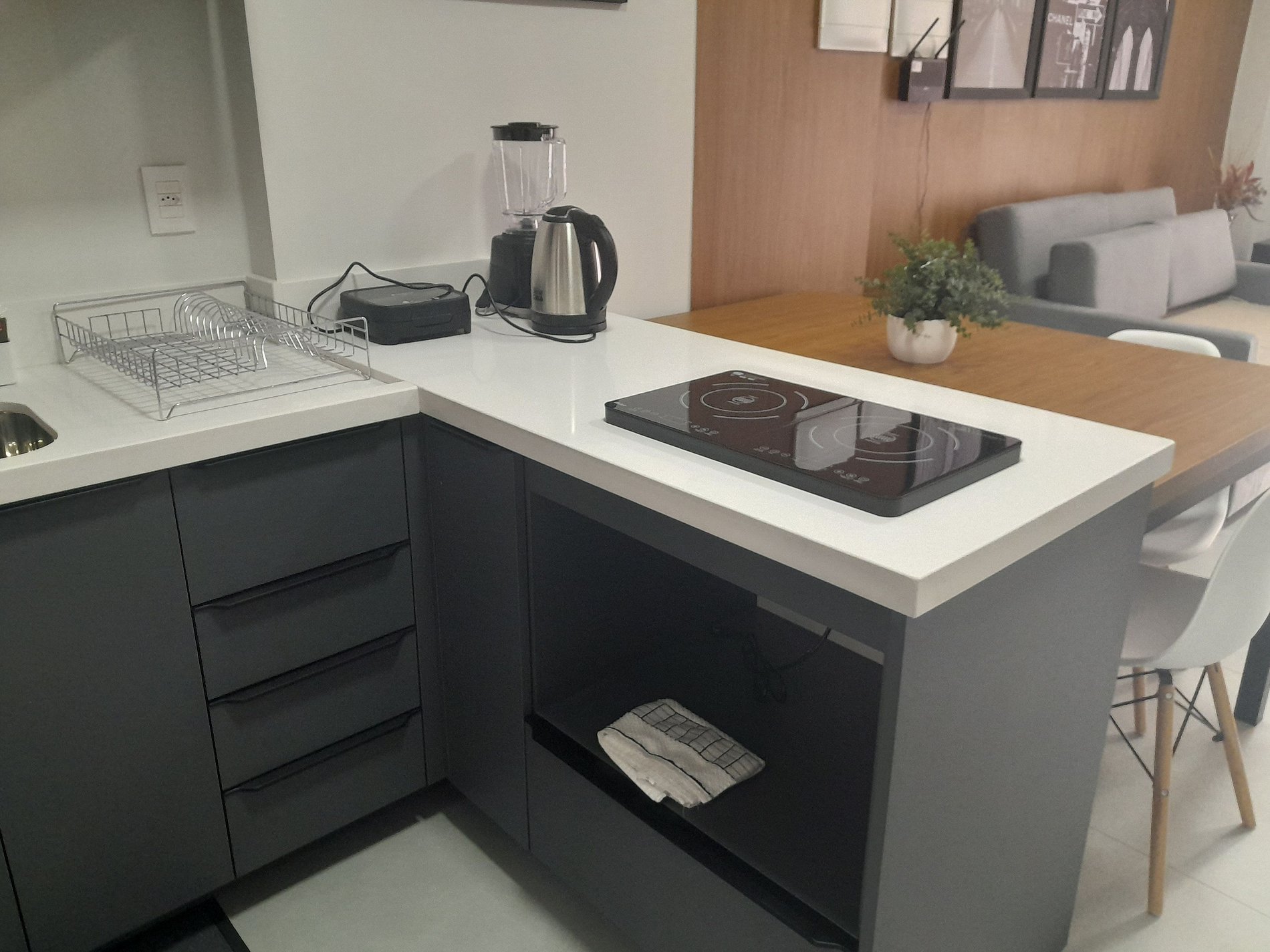 - Cozinha completa com geladeira, fogão cooktop por indução, micro-ondas, cafeteira elétrica, chaleira comum, taças de vinho, panelas, louças e utensílios;