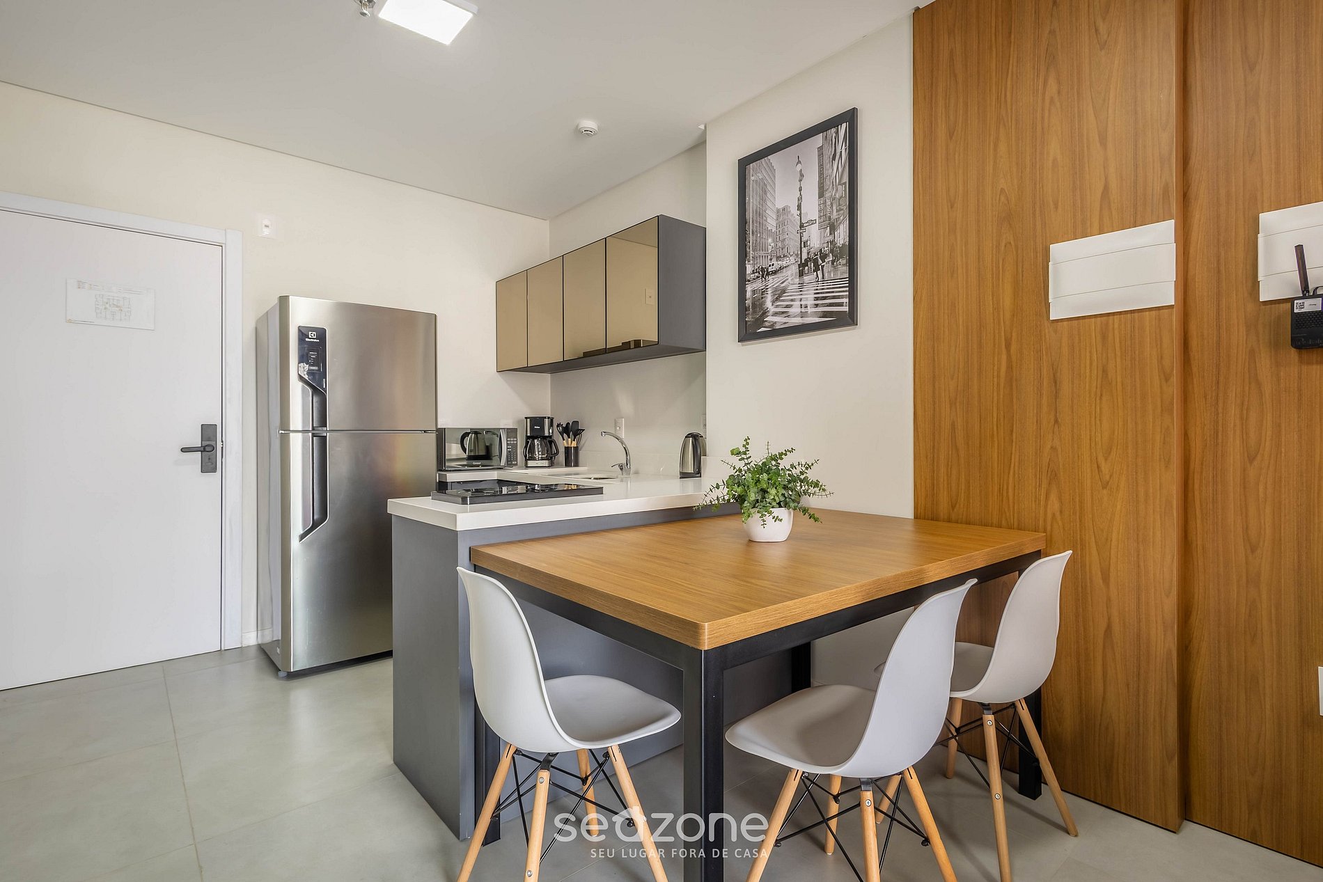 - Espaço para jantar com mesa e cadeiras;