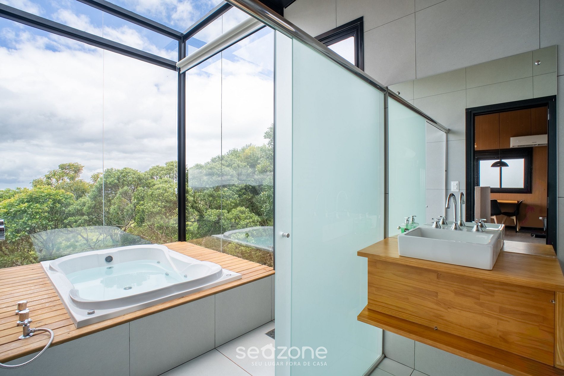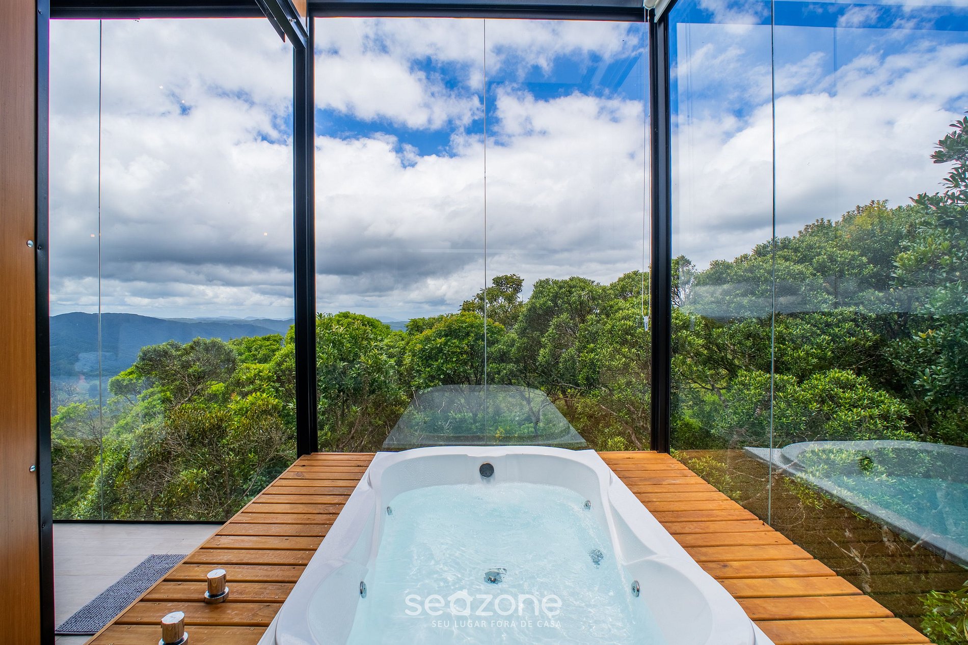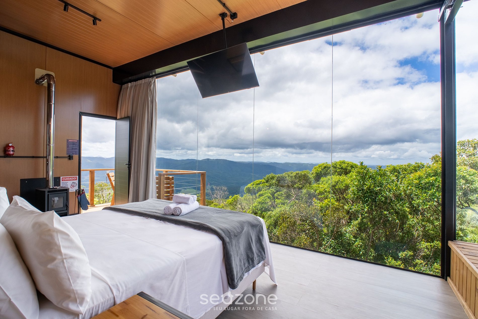 - 1 Cama queen size, 1 cama auxiliar solteiro, lareira, Smart TV, jacuzzi com hidromassagem e janelas panorâmicas;