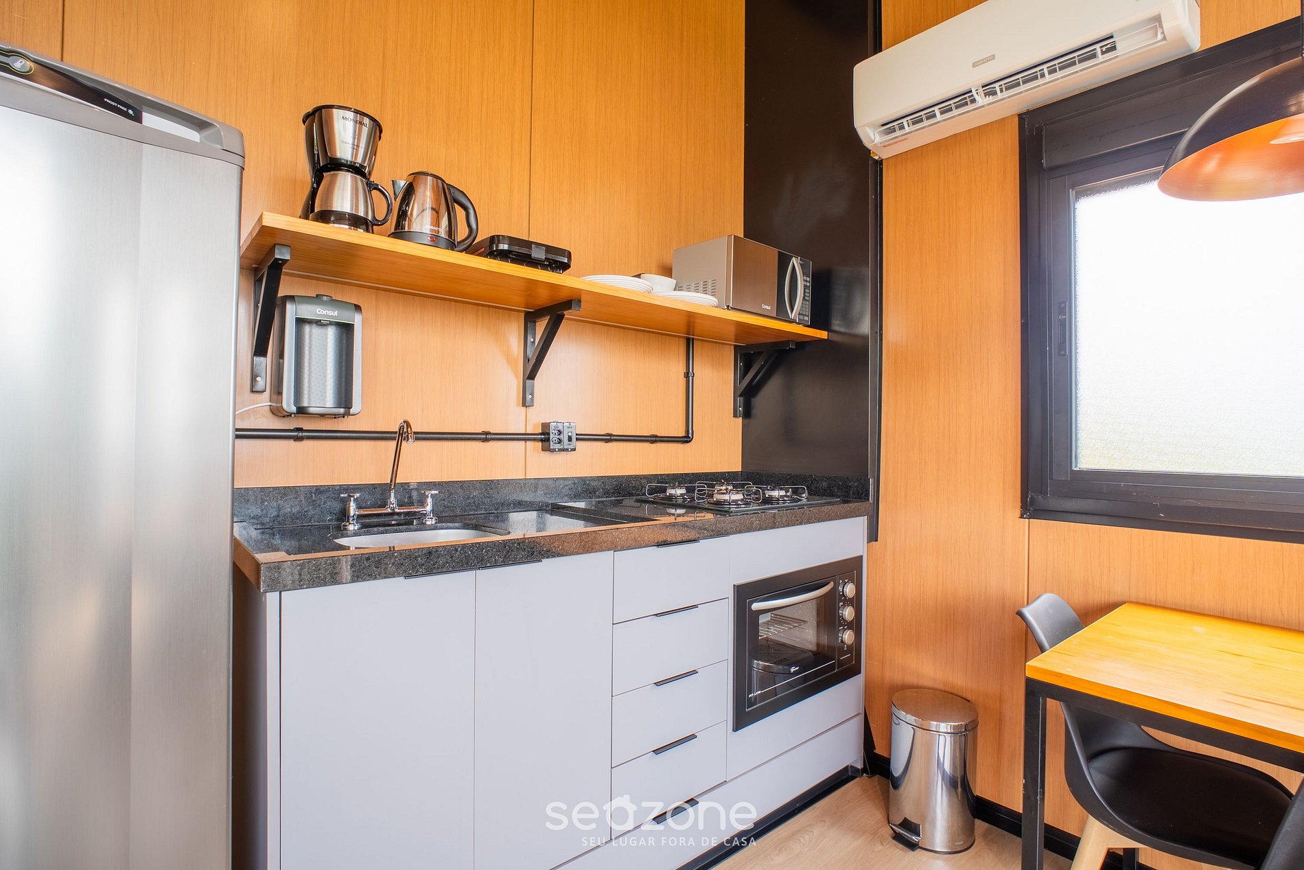 - Cozinha compacta, porém completa, com geladeira, cooktop a gás, forno elétrico, sanduicheira, cafeteira, chaleira elétrica, liquidificador, panelas, louças e utensílios diversos (sal, óleo, etc);