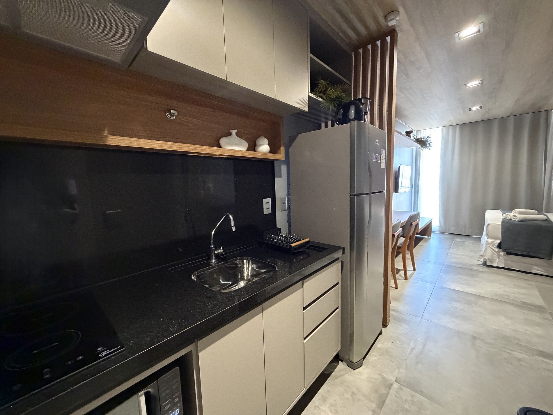 - Cozinha com geladeira, fogão cooktop por indução, microondas, sanduicheira, cafeteira elétrica, chaleira elétrica, liquidificador, taças de vinho, panelas, louças e utensílios;