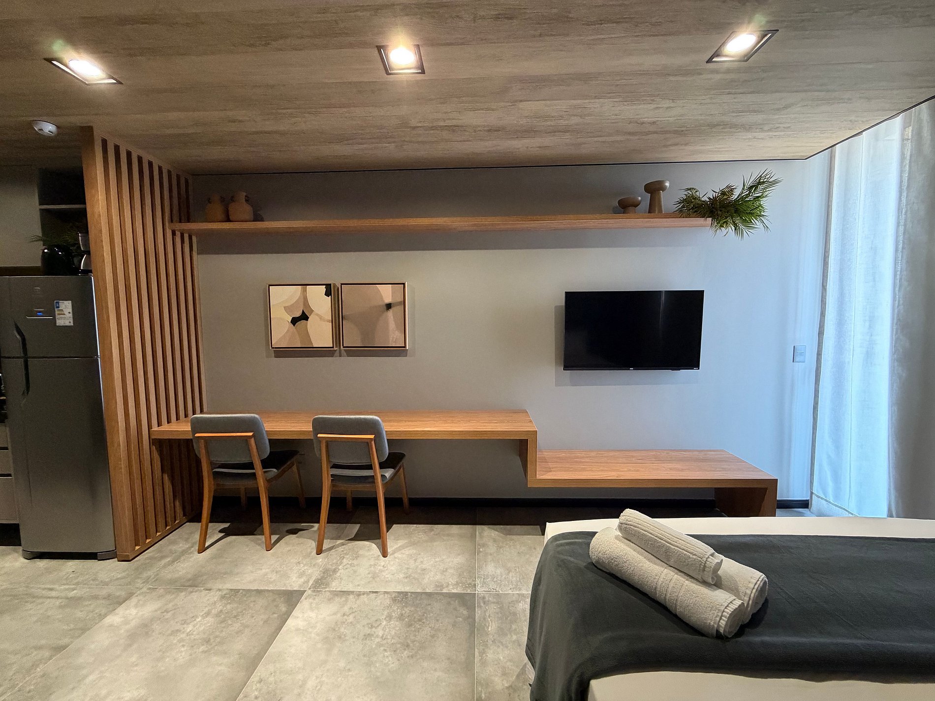 - 1 cama de casal queen size, cortinas blackout, arara para roupas, smart TV e ar-condicionado;