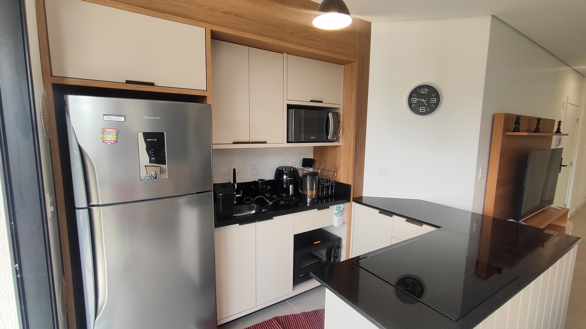 - Cozinha completa com geladeira, fogão cooktop por indução, forno elétrico, microondas, sanduicheira, Kit café (suporte para filtro, garrafa térmica), chaleira elétrica, liquidificador, taças de vinho, panelas, louças e utensílios;