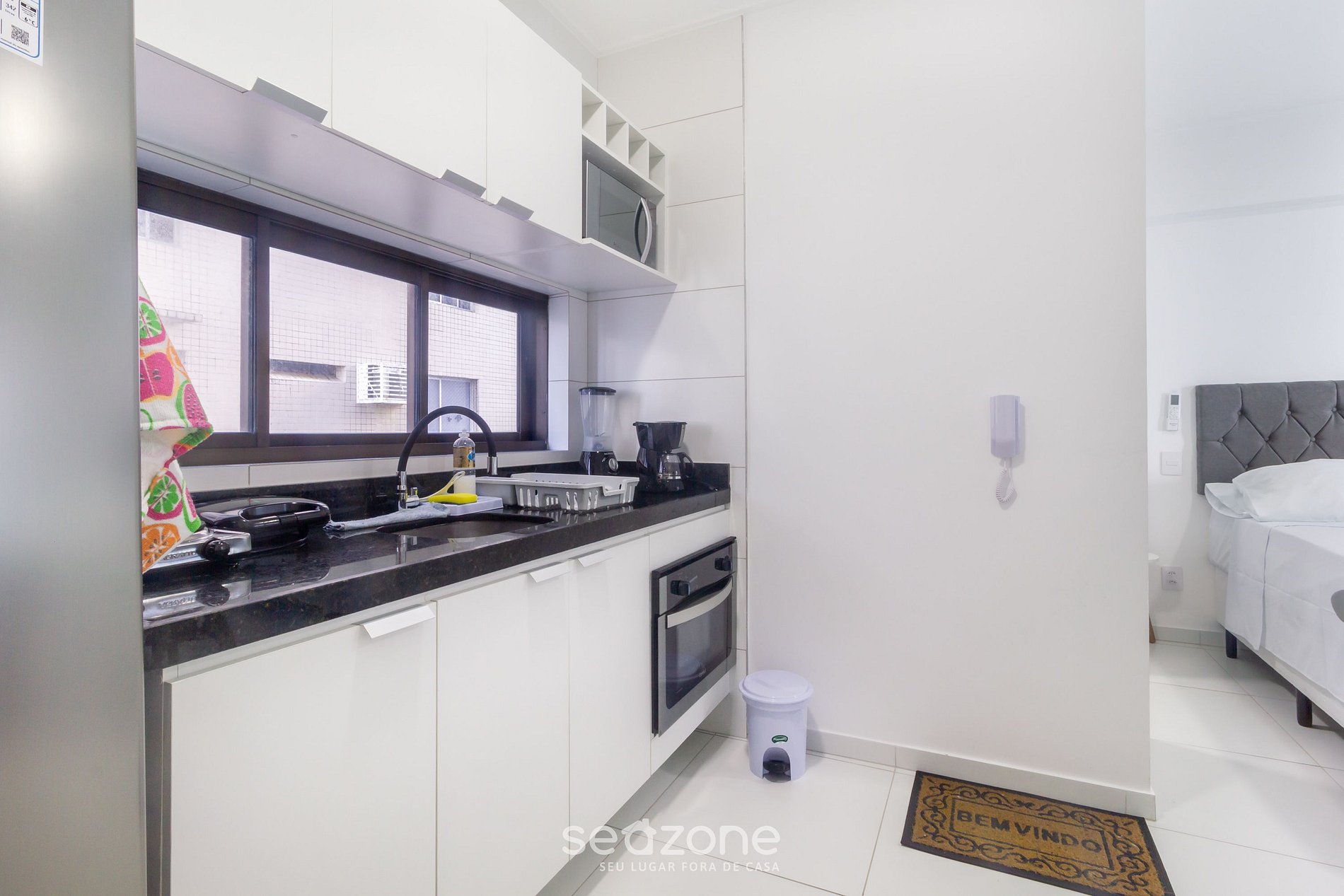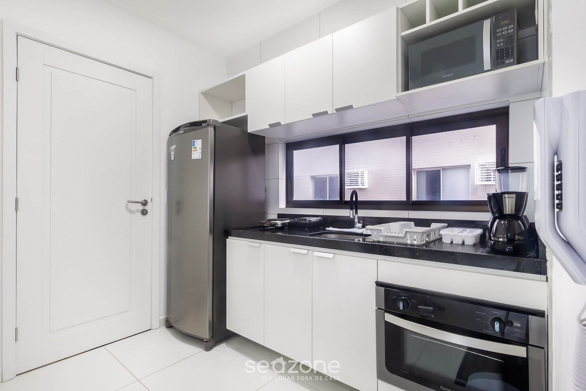 - Cozinha compacta com geladeira, fogão, forno, micro-ondas, sanduicheira, cafeteira elétrica, liquidificador, taças de vinho, panelas, pratos e utensílios;