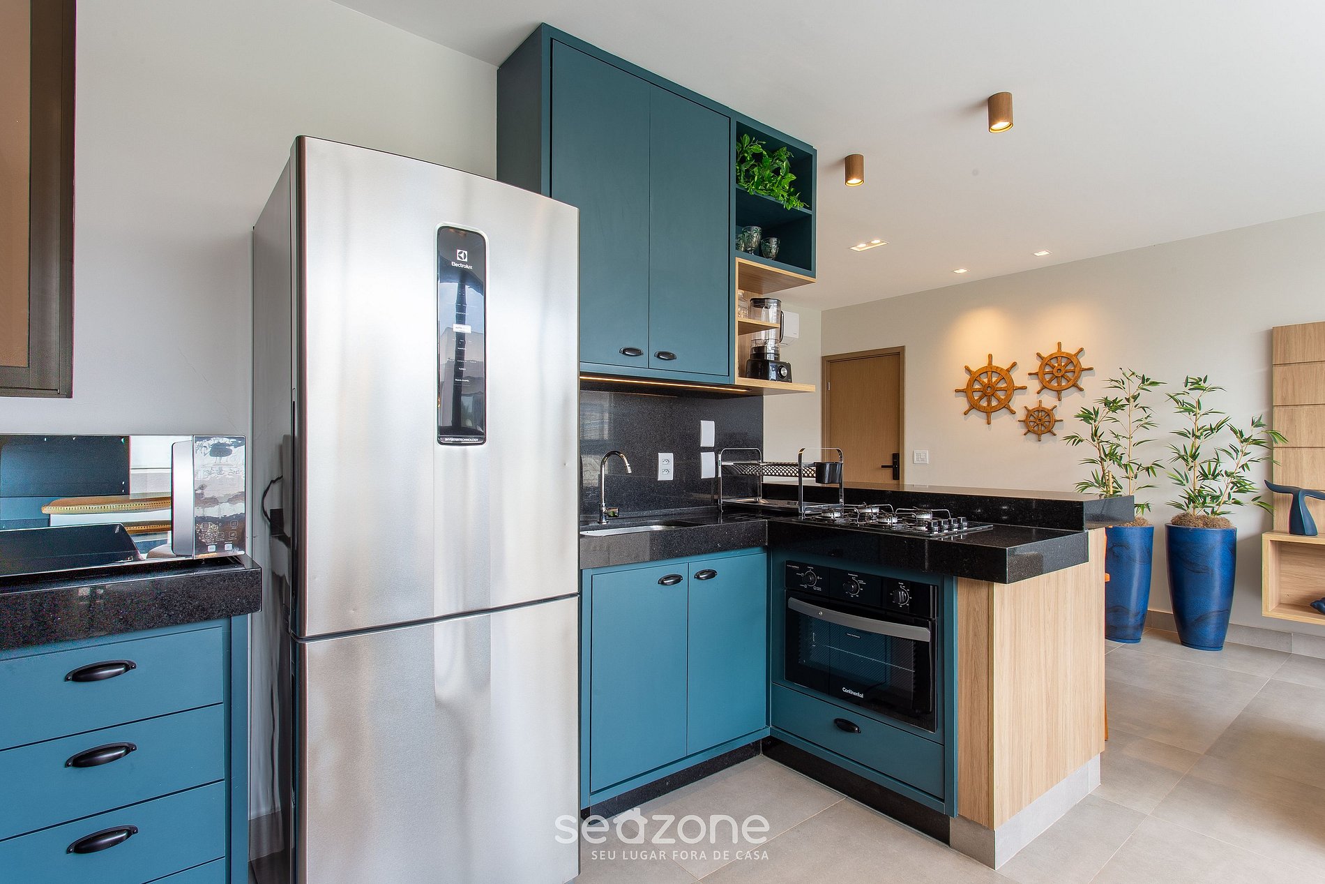 - Cozinha completa com geladeira, fogão cooktop (gás), forno elétrico, microondas, Airfryer, Kit café (suporte para filtro, garrafa térmica), liquidificador, taças de vinho, panelas, louças e utensílios;