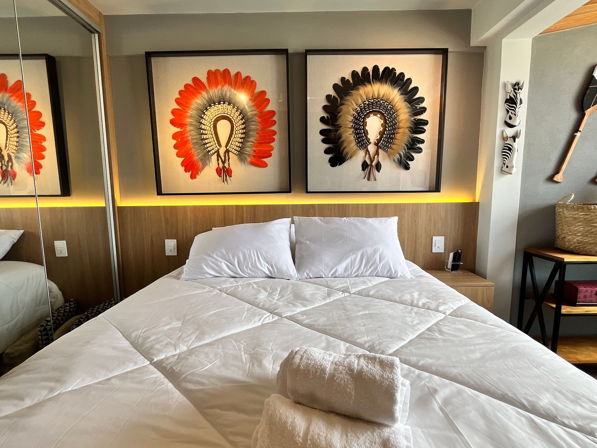 - Cama queen, armário, Smart TV, armário, espaço para trabalho e ar-condicionado;