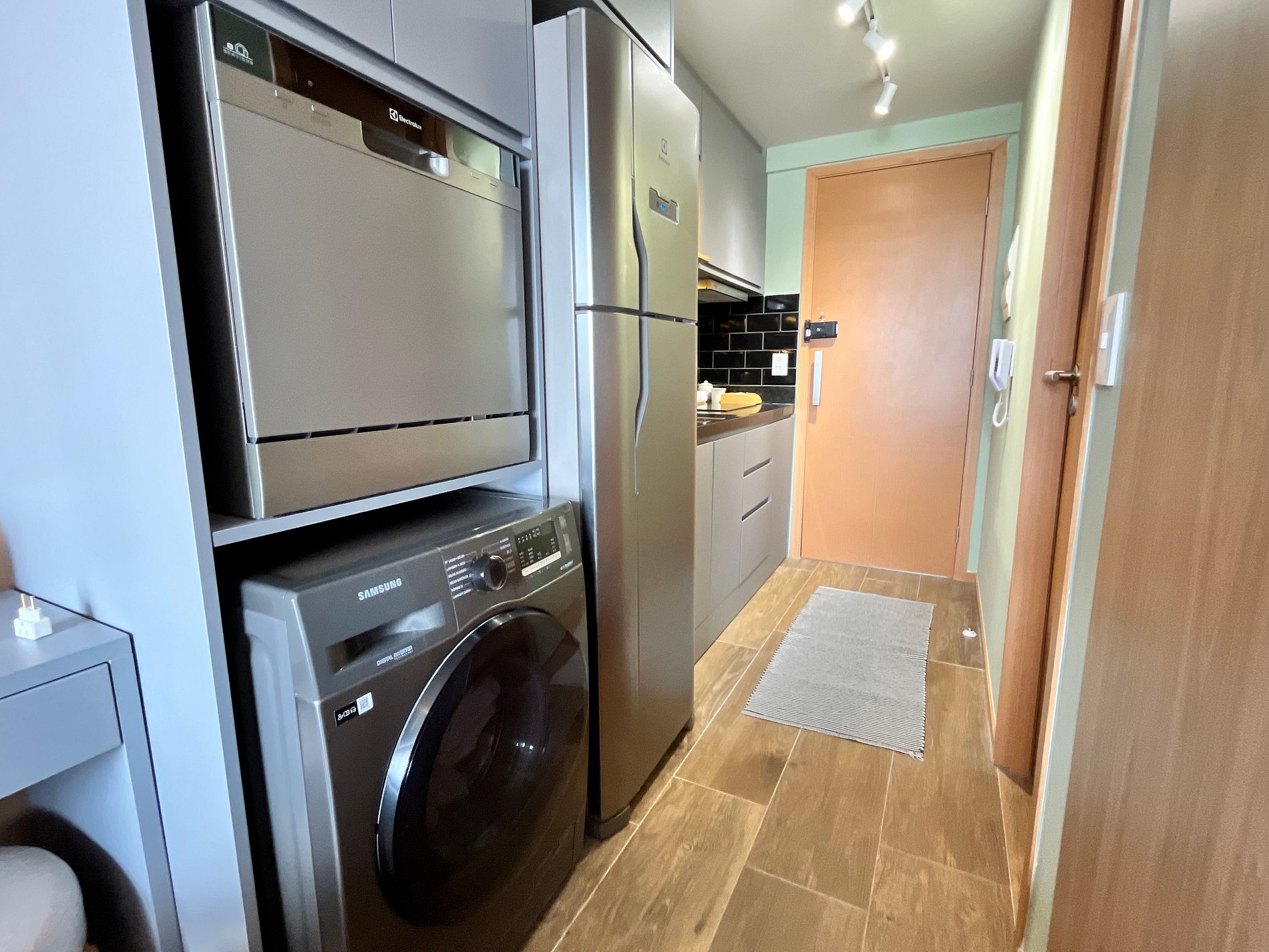 - Cozinha completa com geladeira, cooktop de indução, airfryer, micro-ondas, sanduicheira, cafeteira elétrica, chaleira elétrica, liquidificador, taças de vinho, panelas, louças e utensílios;
