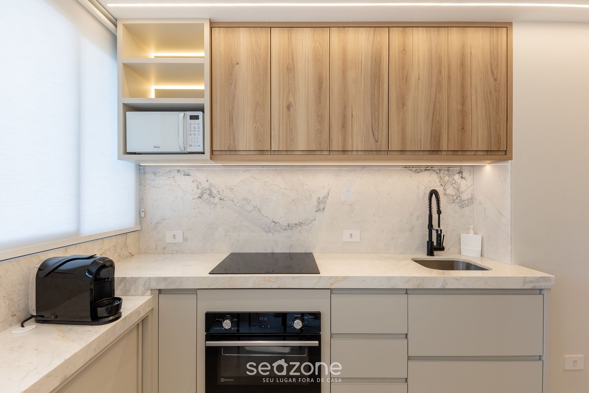 - Cozinha completa com geladeira, micro-ondas, cooktop de indução, forno elétrico, chaleira elétrica, taça de vinho, panelas, louças e utensílios;
