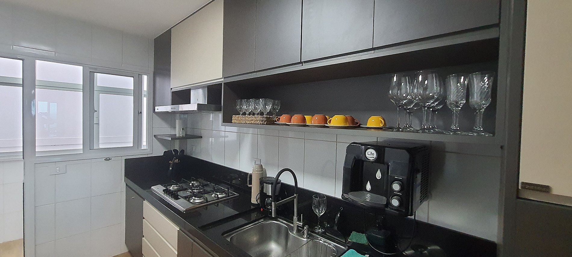 - Cozinha completa com geladeira, fogão cooktop a gás, forno elétrico, micro-ondas, sanduicheira, Kit café (suporte para filtro, garrafa térmica), chaleira, liquidificador, depurador de ar, filtro de água, panelas, louças e utensílios;