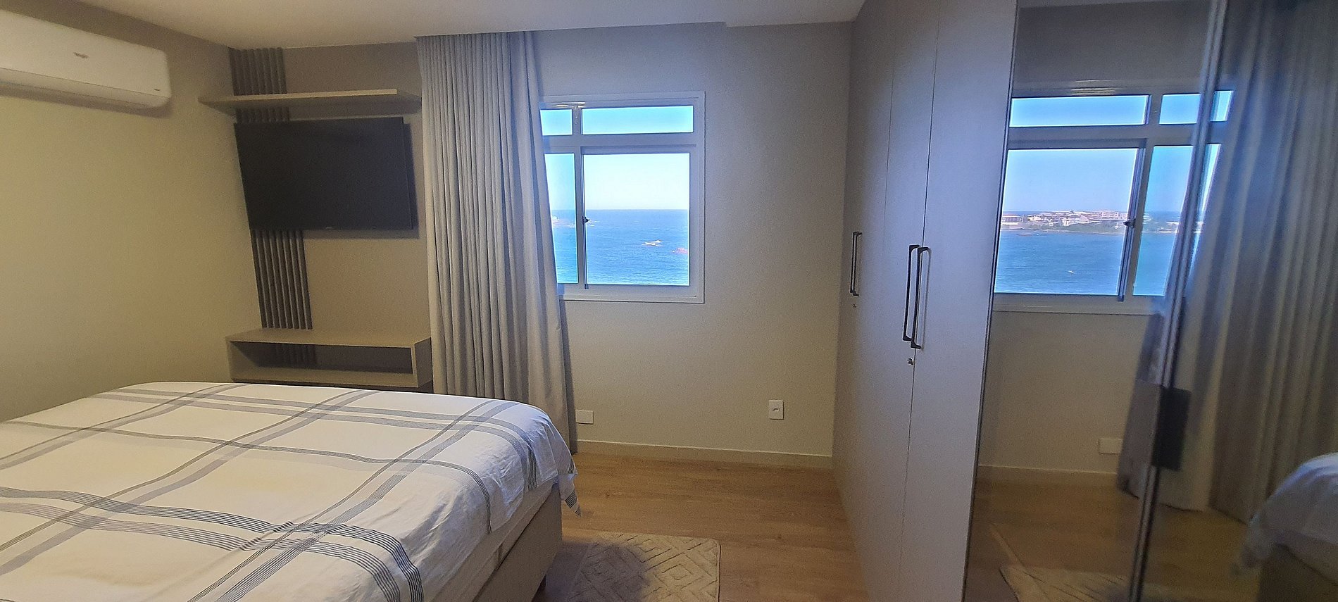 - 1 Quarto com Cama king size, sacada com vista para o mar, armário, Smart TV e ar-condicionado;