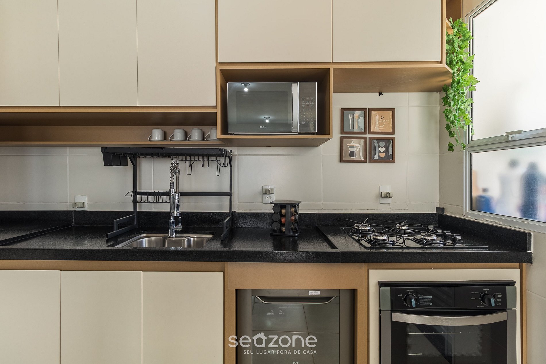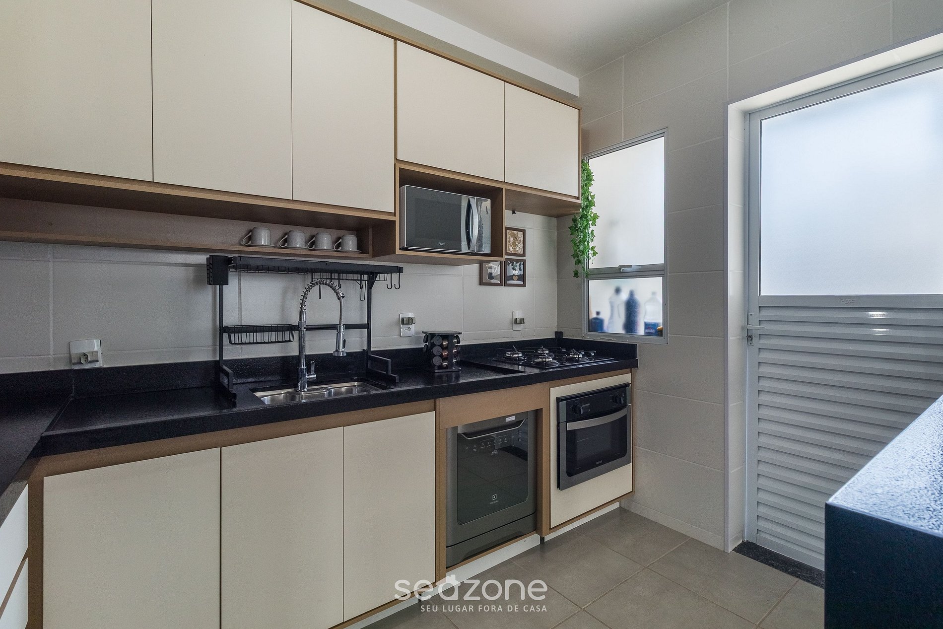 - Cozinha completa com cooktop a gás, forno elétrico, geladeira, micro-ondas, airfryer, cafeteira elétrica, liquidificador, sanduicheira, lava-louças, filtro de água, panelas, louças e utensílios;