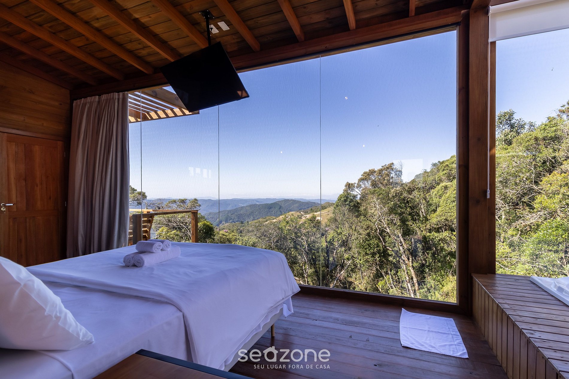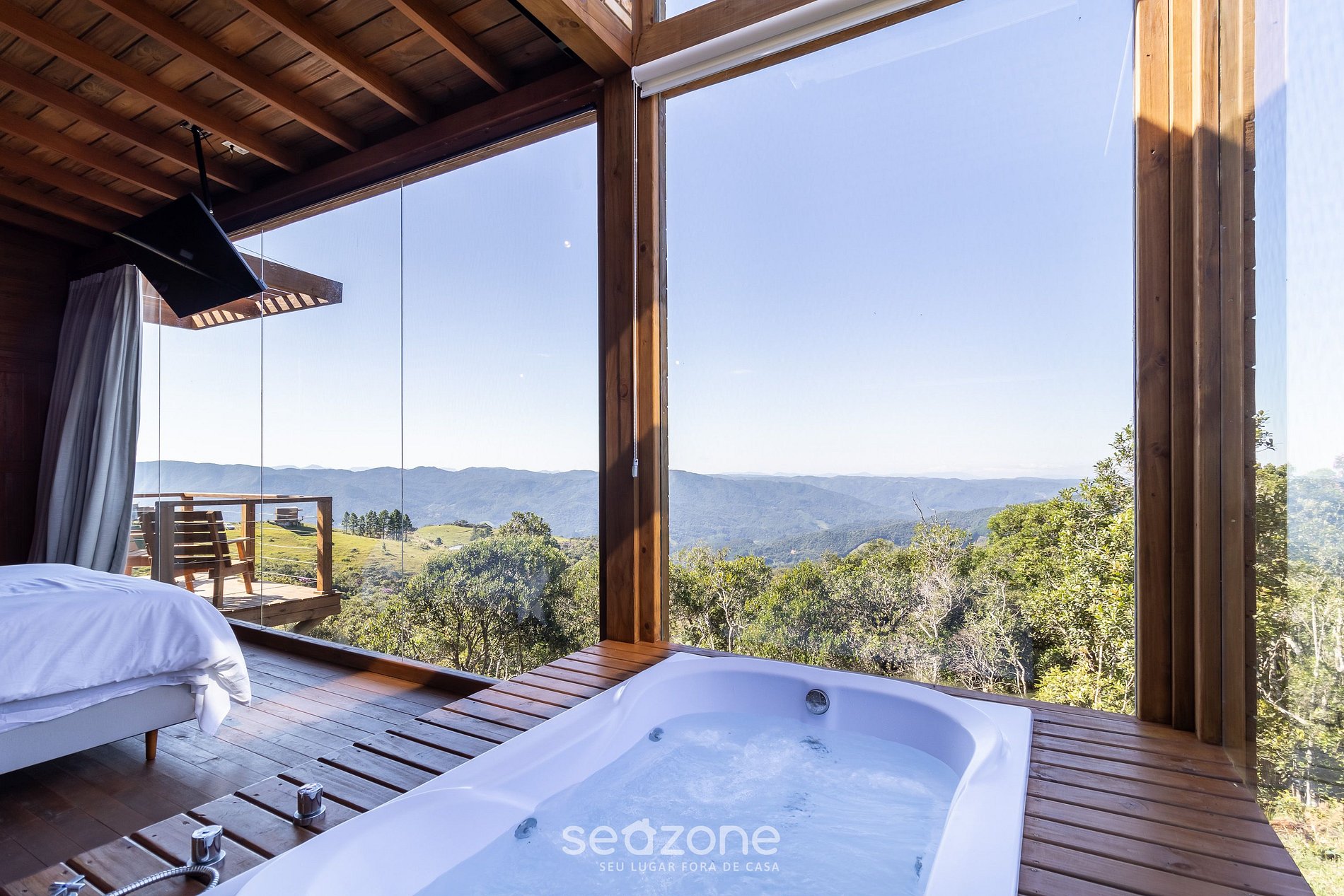 - 1 Cama de casal queen size, 1 cama auxiliar solteiro, lareira, smart TV, jacuzzi com hidromassagem e janelas panorâmicas;