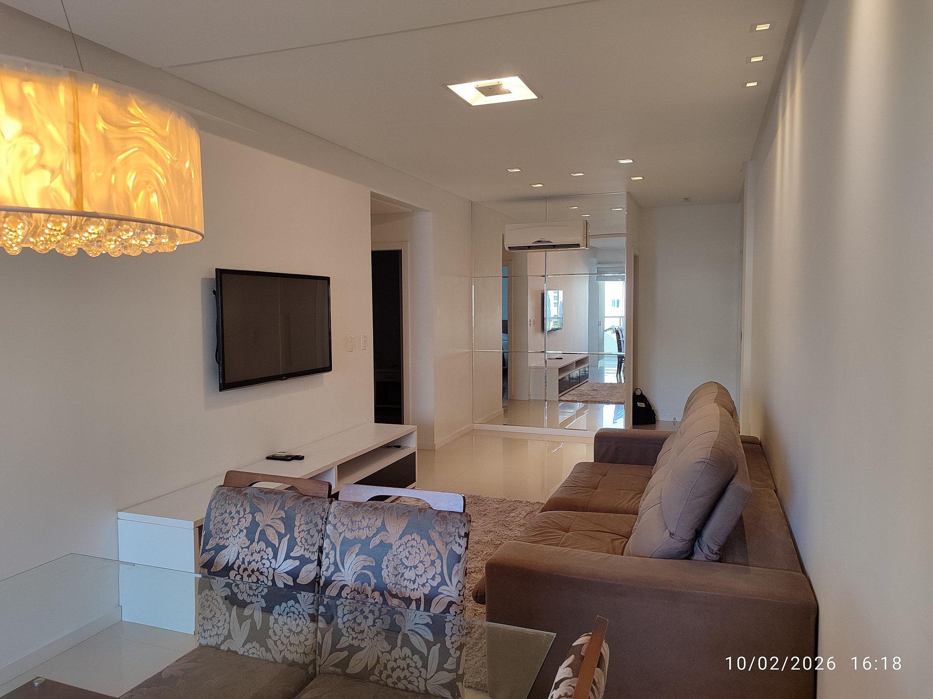 - Sala de estar com sofá, Smart TV e ar-condicionado;