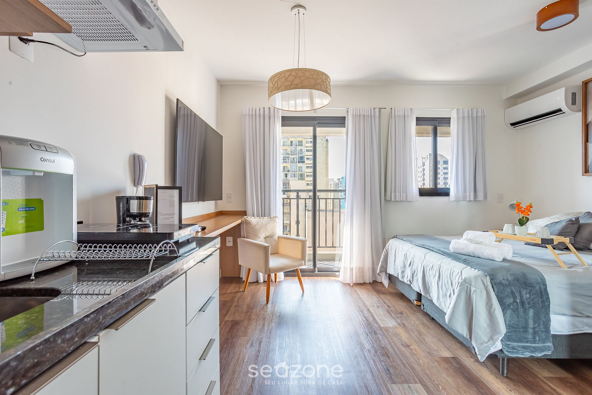 - Estúdio com cama queen, ar-condicionado, guarda-roupa, smart TV;