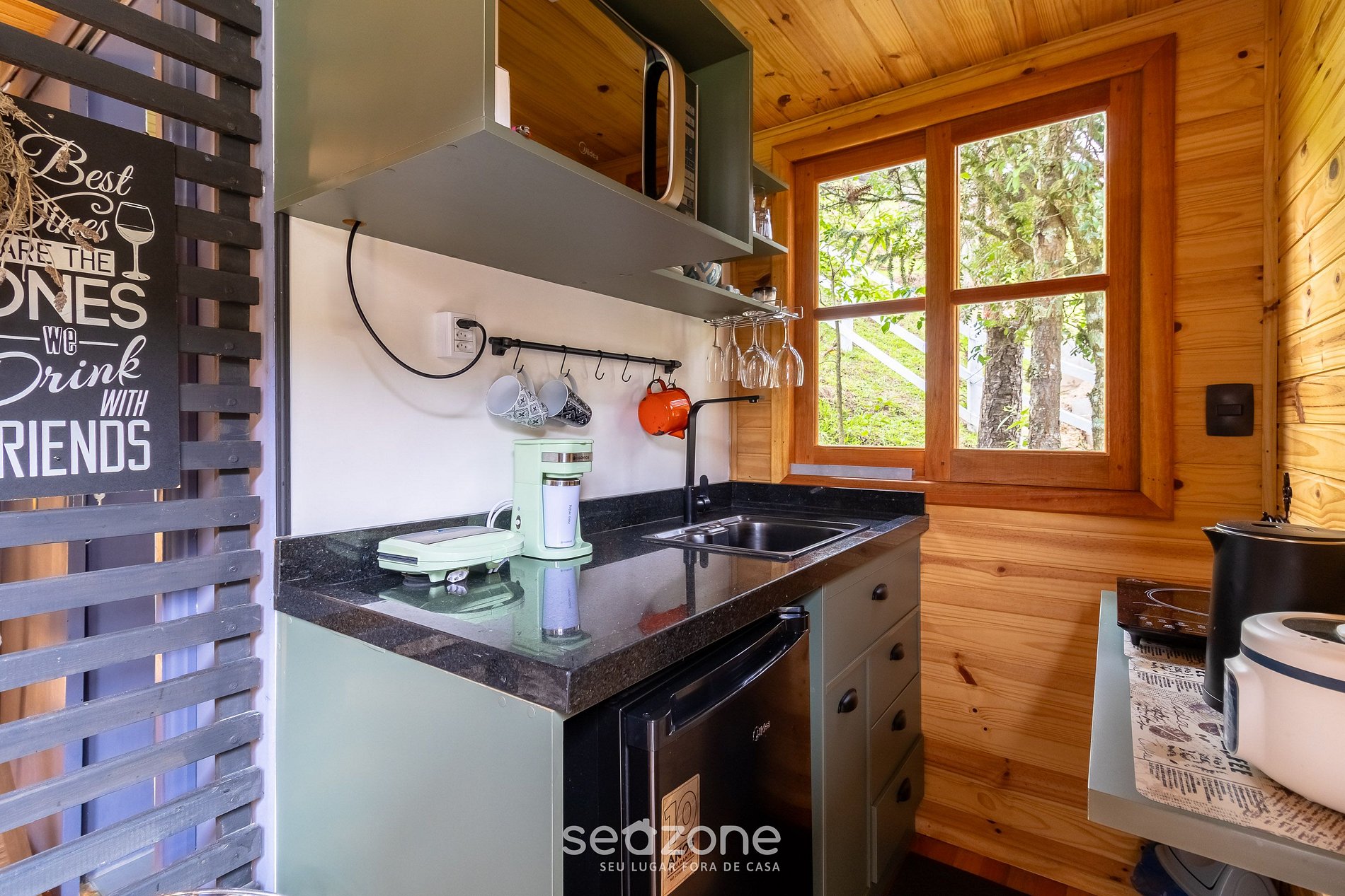 - Cozinha com frigobar, fogão, micro-ondas, sanduicheira, cafeteira, chaleira elétrica, liquidificador, taças de vinho, panelas, louças e utensílios;