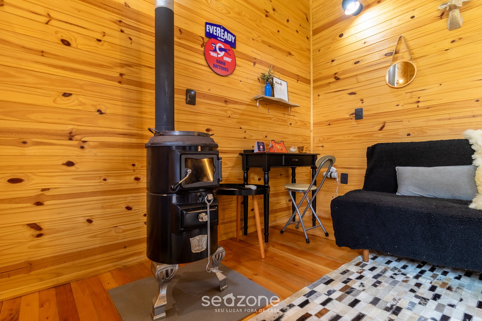 - 1 Cama de casal queen size, arara para roupas, sofá, lareira interna, smart TV e ar-condicionado;