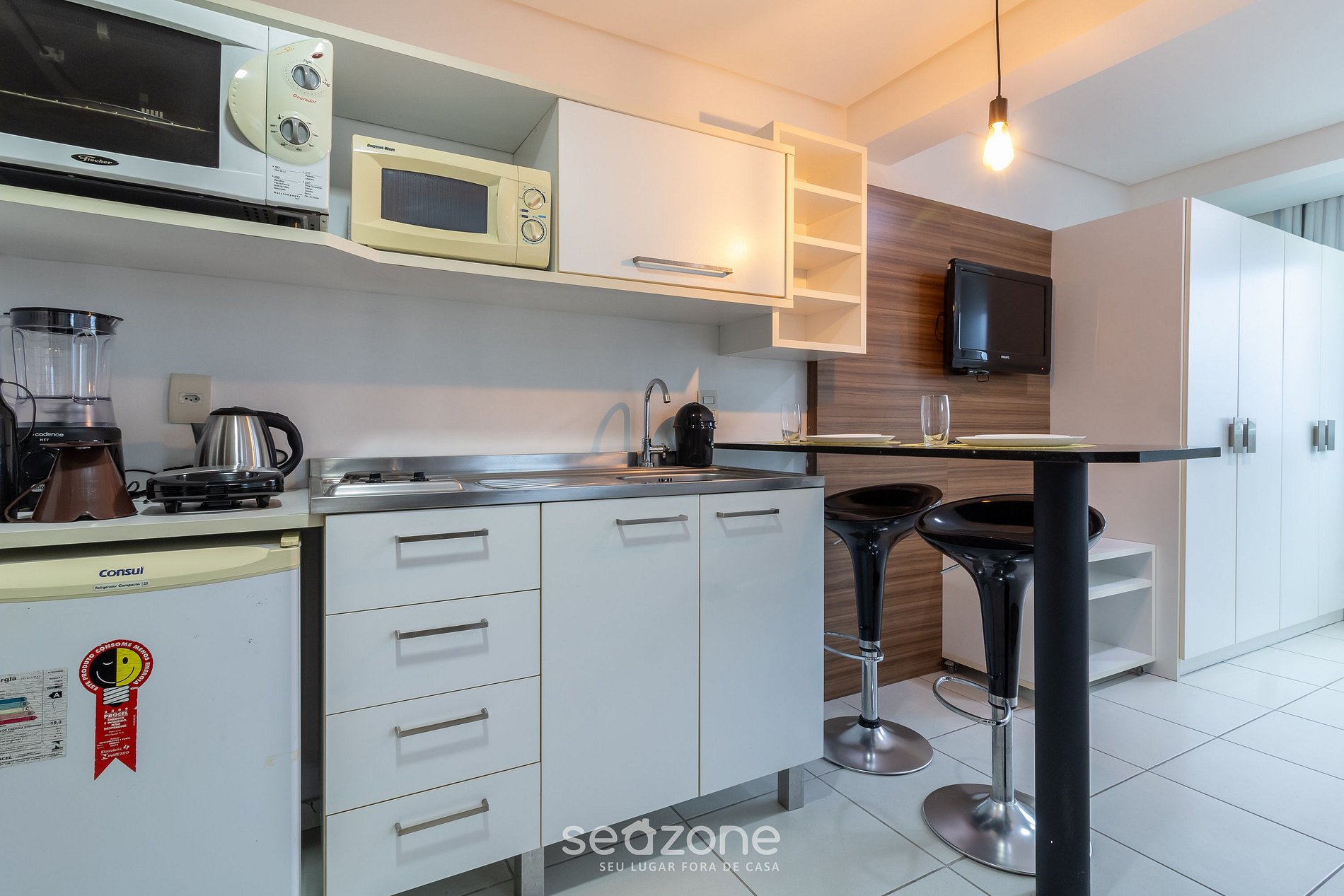 - Espaço para jantar com bancada e 2 cadeiras;
