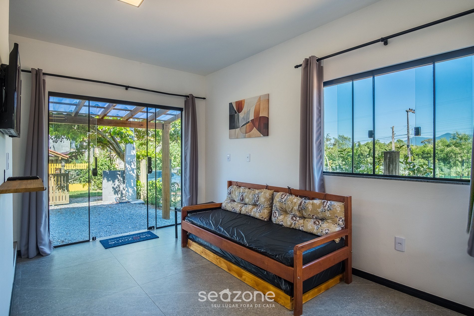 - Sala de estar com sofá bicama, ventilador portátil e Smart TV;