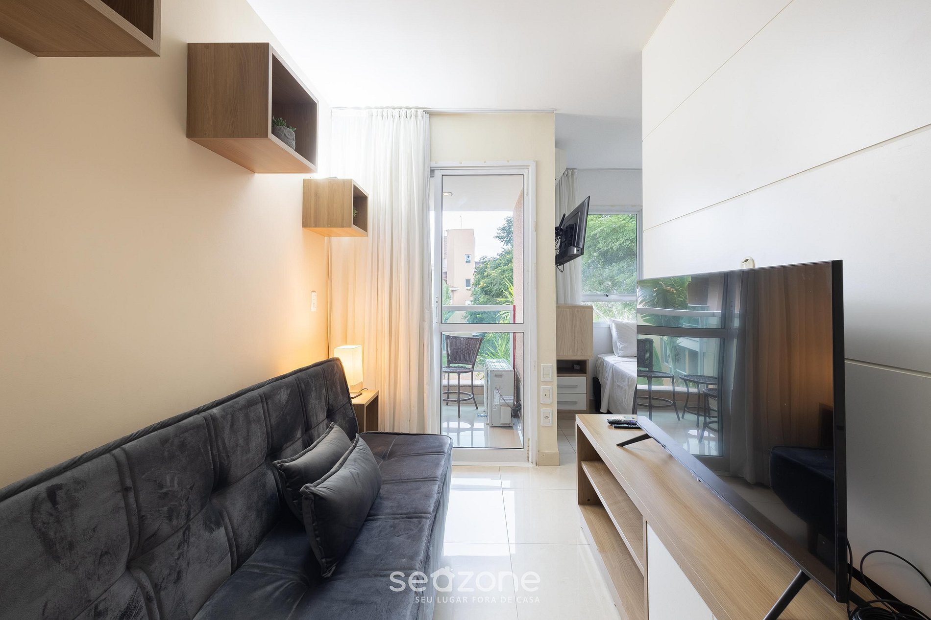 - Sala de estar com sofá e Smart TV;