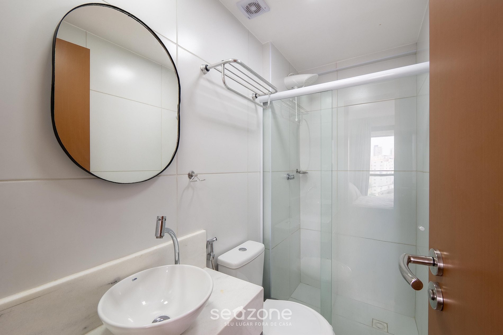 Este estudio conta com cama de casal, ar-condicionado, cozinha completa e Smart TV. A varanda possui vista panorâmica da cidade e o mar ao horizonte. A localização privilegiada permite acesso fácil à Praia, ao Shopping Barra e é cercado por opções gastronômicas, é ideal para quem busca praticidade. O prédio ainda oferece piscina, academia, coworking e garagem.