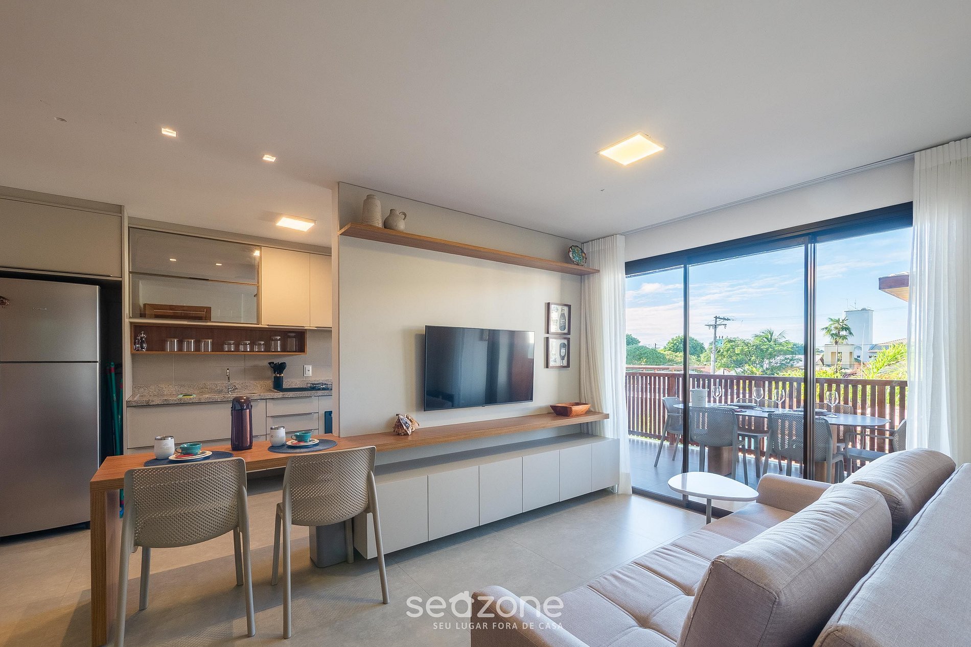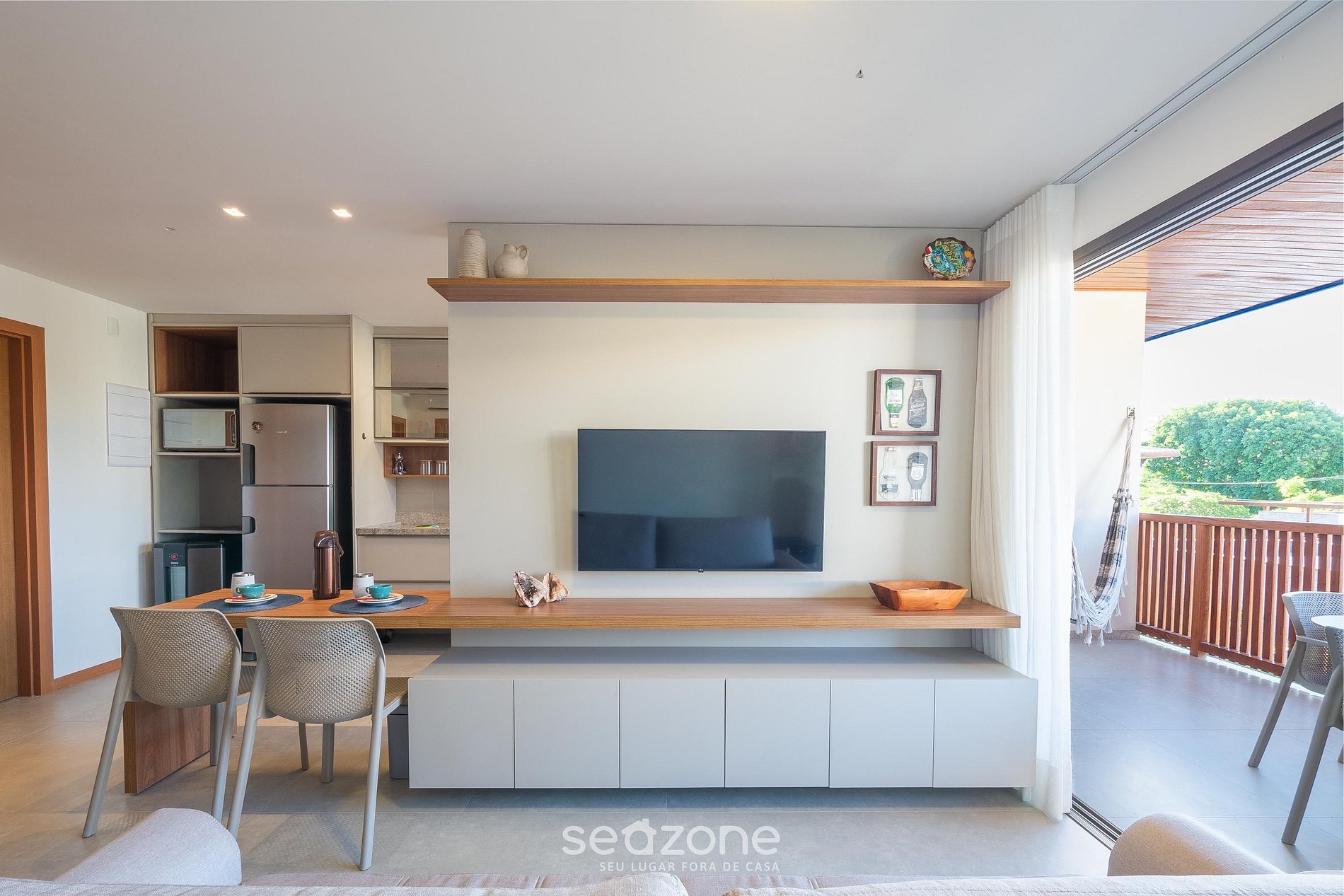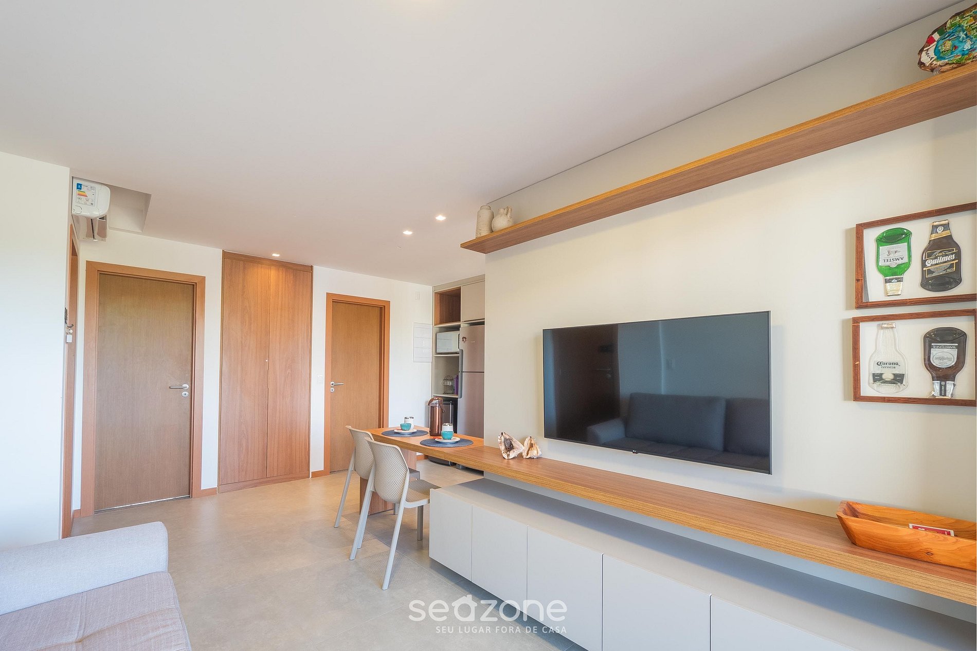 - Sala de estar com sofá, Smart TV e ar-condicionado;